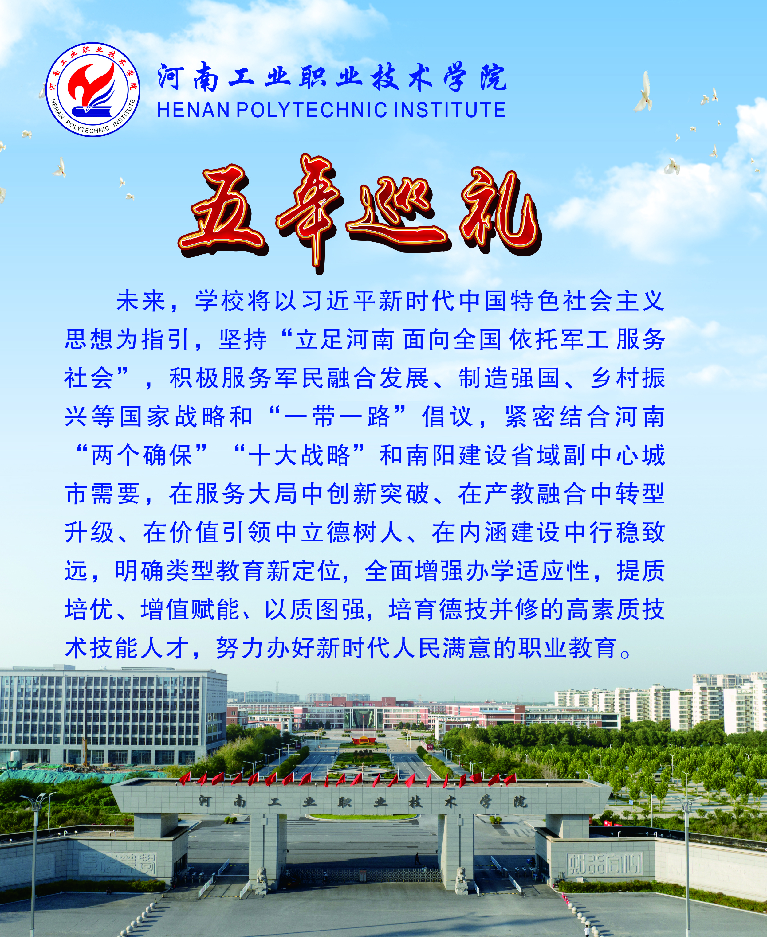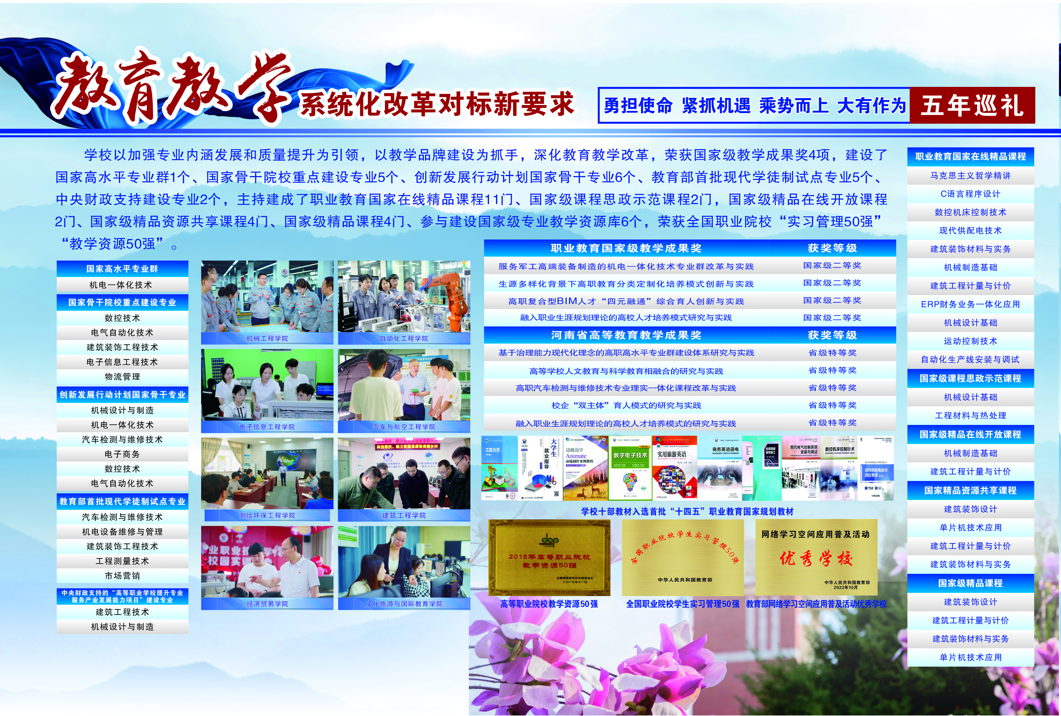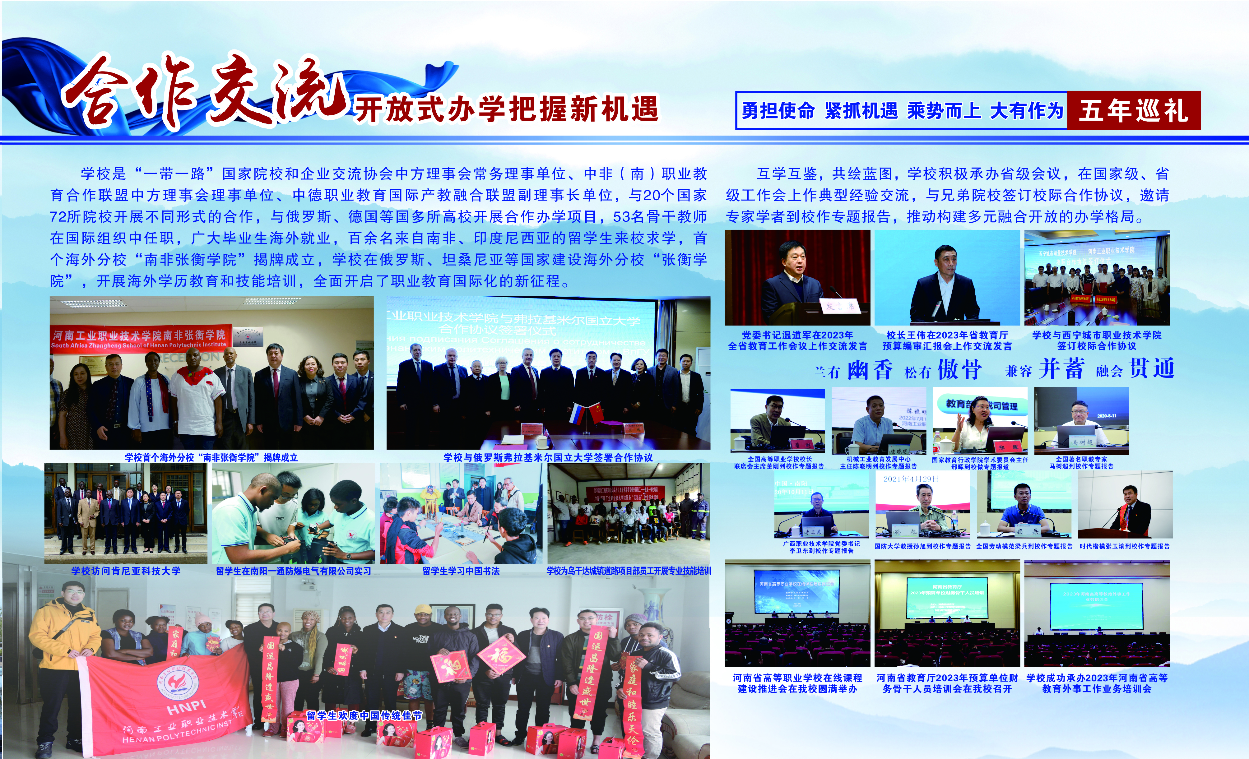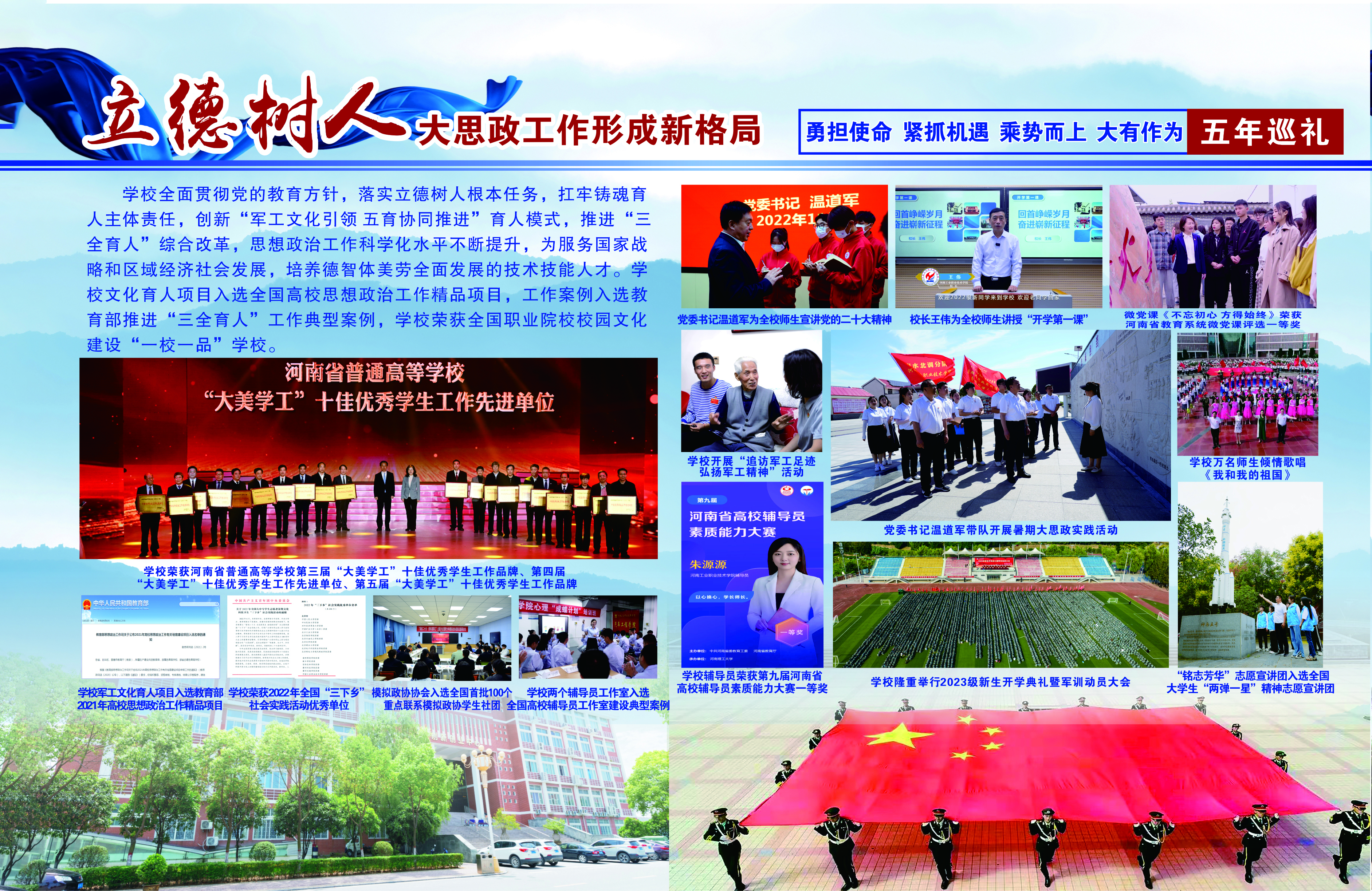 编者按:中国共产党河南工业职业技术学院第三次代表大会召开在即,学校站在新的历史发展节点。作为中国特色高水平高职学校和专业建设计划建设单位,五年来,学校深入贯彻习近平总书记关于职业教育的重要指示精神,坚持党的全面领导,落实立德树人根本任务,在服务国家战略中答好新的时代答卷,在职业教育改革发展的大潮中勇担使命、紧抓机遇、乘势而上、大有作为,实现高质量发展。近日,党委宣传部筹备制作“五年巡礼”办学成果展,精选图文材料,全方位展示学校第二次党代会以来,砥砺前行、跨越发展的丰硕成果,激励全校师生以更加昂扬的姿态走好新的赶考之路。(供稿/党委宣传部 图文/杨爽 杨纪争 单位审核/赵国峰 编审/杨洋)