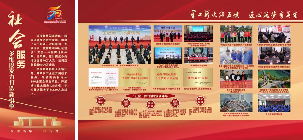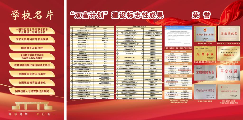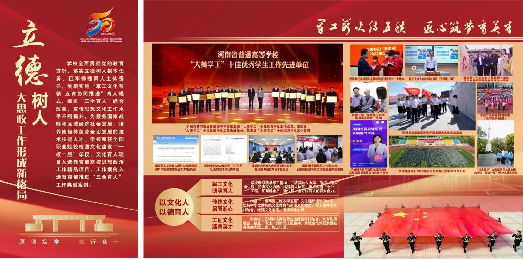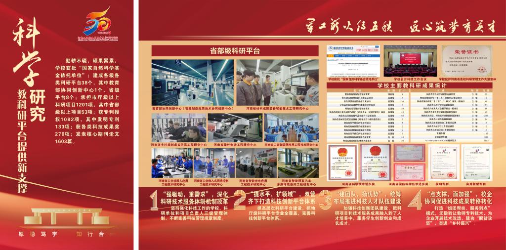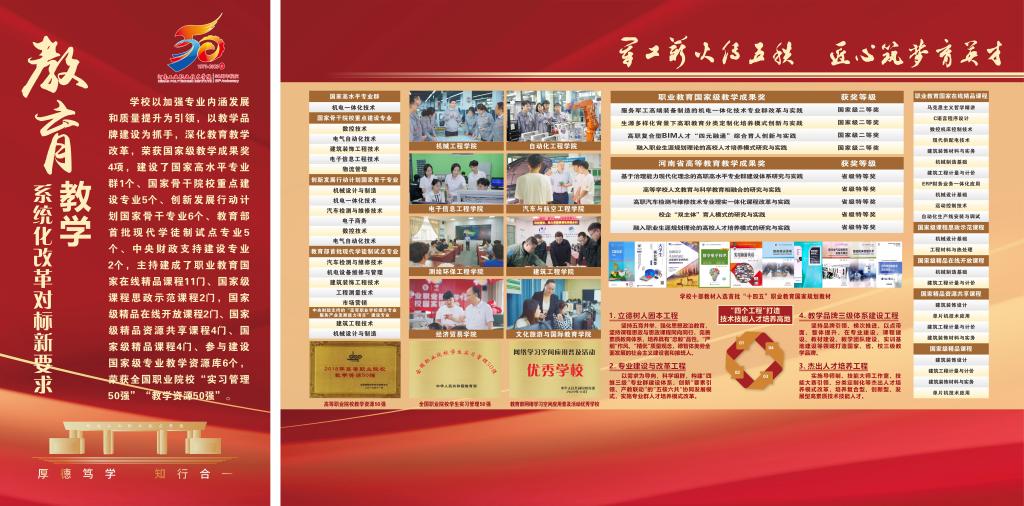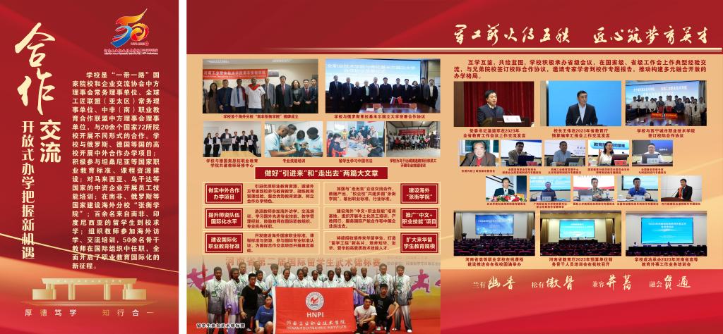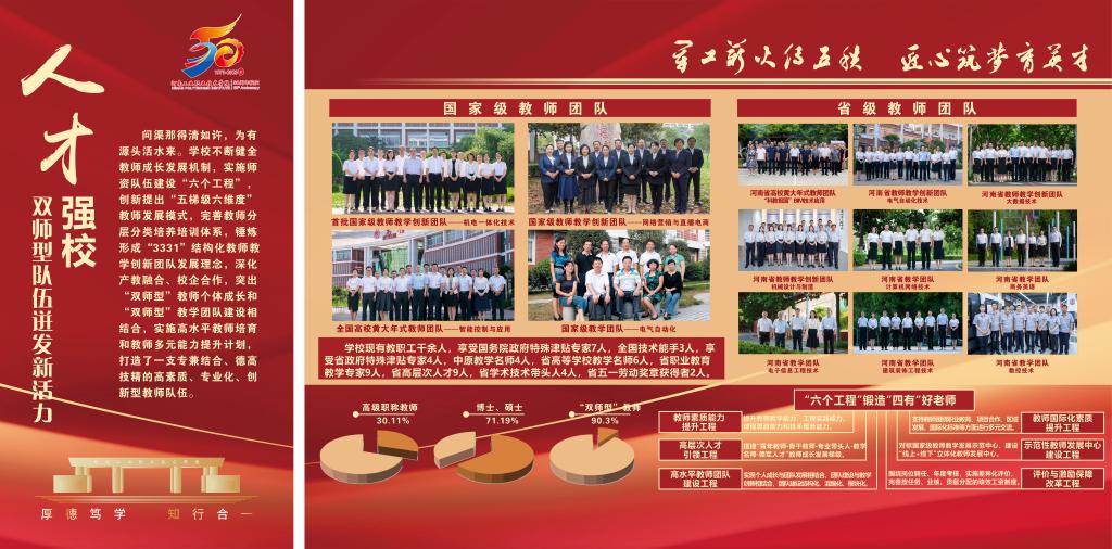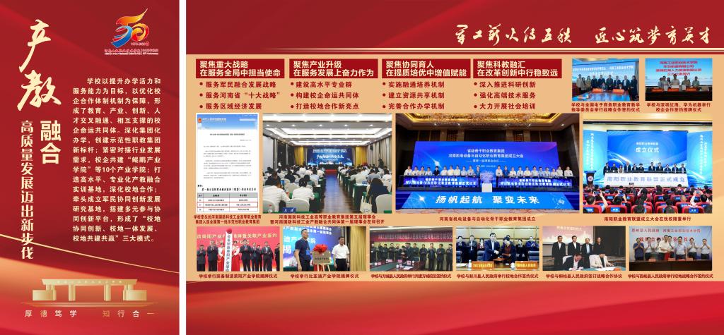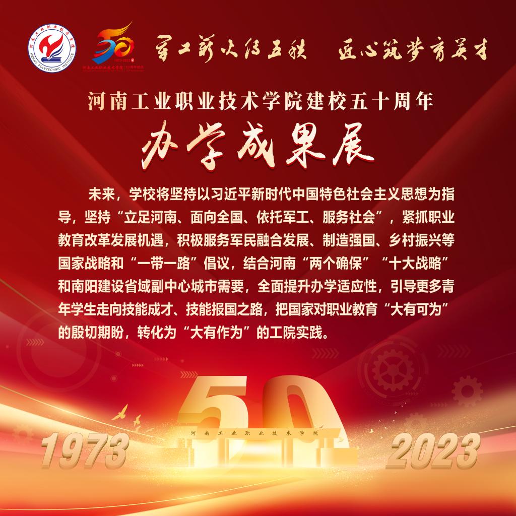 编者按:50年,只是历史长河中的一瞬,却镌刻着河南工业职业技术学院弦歌不辍、薪火相传、砥砺奋进、跨越发展的辉煌历程。从萌芽到扎根,从拔节向上到硕果累累,学校紧抓职业教育改革发展机遇,在服务大局中创新突破、在产教融合中转型升级、在价值引领中立德树人、在内涵发展中行稳致远,走出了一条扎根中原大地,建设中国特色高水平高职学校的奋进之路,培养了十万余名高素质技术技能人才,为国防科技工业和经济社会发展注入澎湃动能。近日,党委宣传部筹备制作建校五十周年办学成果展,精选图文材料,全方位展示砥砺前行、跨越发展的丰硕成果,激励全校师生以更加昂扬的姿态走好新的赶考之路。(供稿/党委宣传部 图文/刘天恒 单位审核/赵国峰 编审/杨爽)