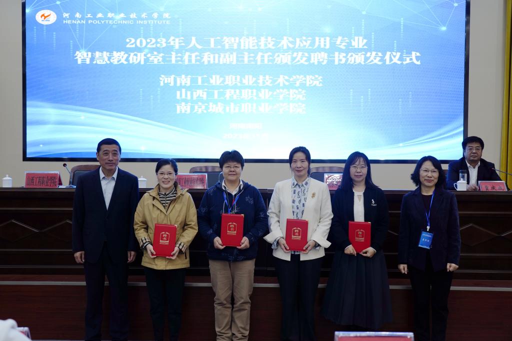 王宇宣读人工智能技术应用专业职业教育专业教学资源库联盟章程,建设院校互相讨论并通过此章程;江景宣读人工智能技术应用专业智慧教研室成立文件。