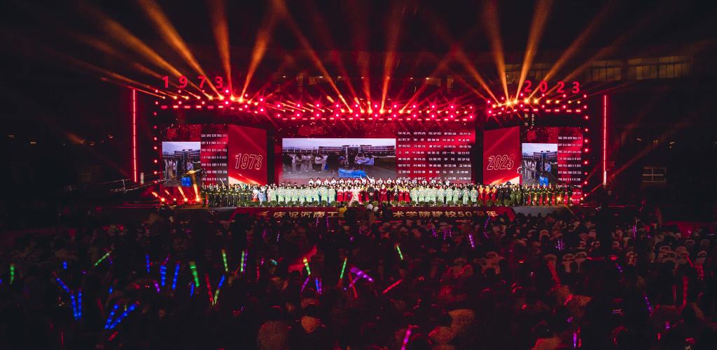 11月16日晚,学校在孔明路校区隆重举行庆祝建校50周年文艺晚会。校领导温道军、王伟、杜建根、王仁伟、屈保中、樊有平、马小兵及学校老领导、校友代表、师生代表等万余人齐聚神舟广场,共同庆祝学校建校50周年华诞。晚会同步进行网络直播,全体师生共度欢乐时刻。