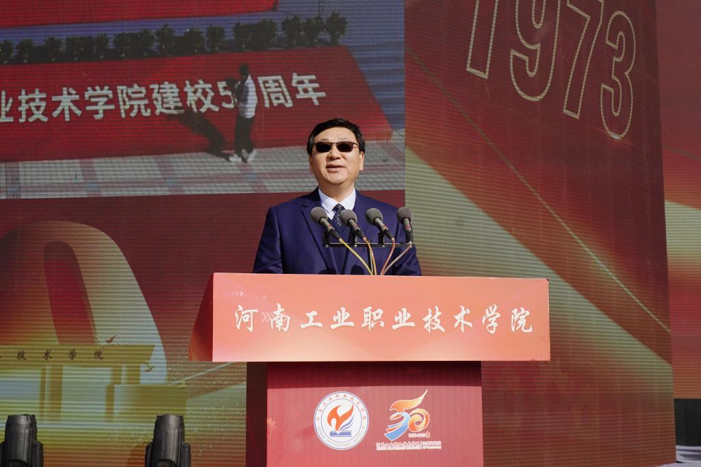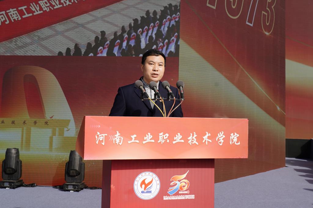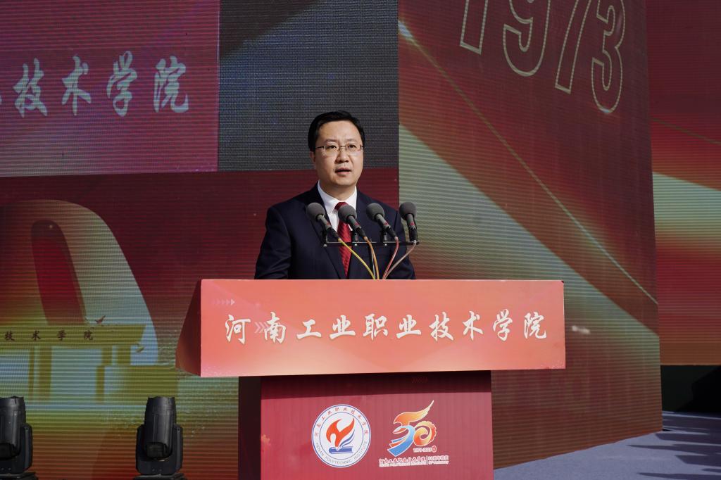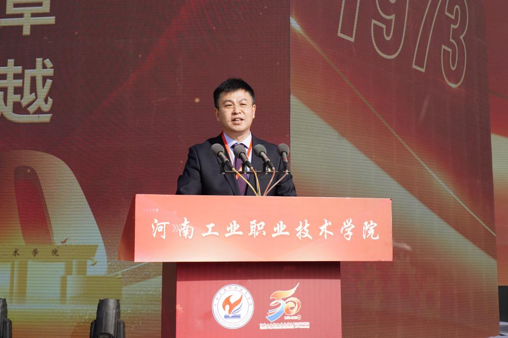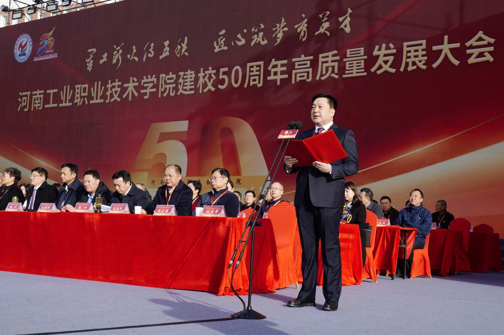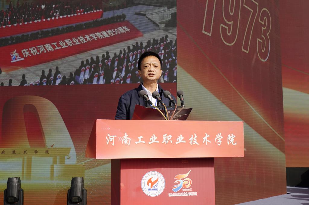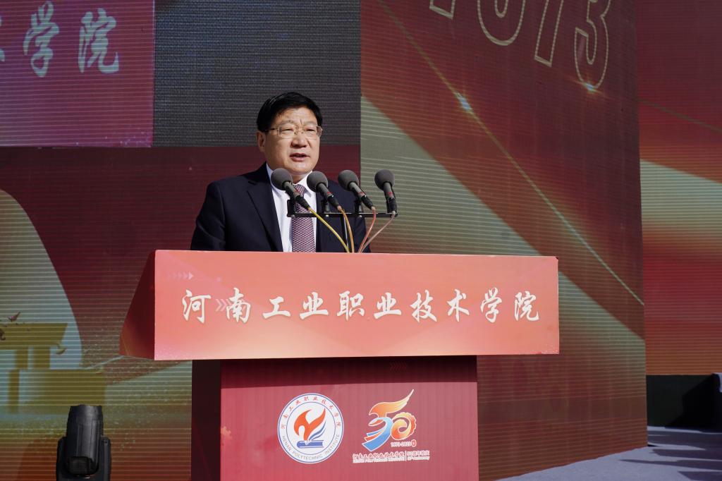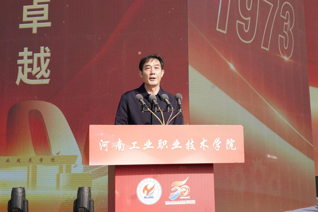 范勇代表中共南阳市委、南阳市人民政府,向学校建校50周年表示热烈的祝贺。他在讲话中指出,50年来,一代代工院人风雨兼程、攻坚克难,秉承“厚德笃学,知行合一”的校训,瞄准地方经济社会发展需求,积极参与南阳重大发展战略,为高质量建设省域副中心城市提供了坚实的智力支持和人才支撑。他表示,南阳市委、市政府高度重视教育事业发展,把构建现代职业教育体系作为建设现代化南阳的重点方向,在顶层设计、政策保障、资金投入、配套设施建设等方面,为职业学校出台了一系列优惠政策,推动职业教育实现了快速发展,希望学校继续发扬优良办学传统,不断强化内涵建设,提高关键办学能力,提升技能人才培养水平,持续扩大办学影响,为教育强国和民族复兴培养更多堪当时代大任的技能人才、能工巧匠和大国工匠。
