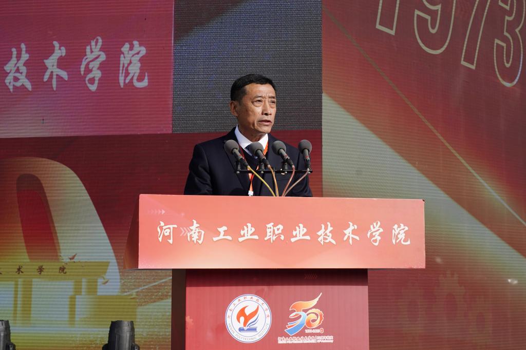 朱自锋在讲话中指出,学校应军工需求而生、在服务军工中成长、与军工行业深度融合发展,建校50年来,虽历经多次变迁、划转和调整,但学校坚持军工传统、军工文化、军工特色的红色基因从未改变,令人感受到了“热爱”;学校扎根中原大地,以服务学生的全面发展、区域经济社会发展和国家战略为己任,赓续红色血脉,秉承优良办学传统,在不负岁月、共赴山河中取得了骄人成就,赢得了诸多瞩目,令人感受到了“光荣”;学校紧密对接军民融合发展、制造强国、乡村振兴等国之大者、省之要者,为国防科技工业和地方经济社会发展,培养输送了一大批高素质技术技能人才、能工巧匠、大国工匠作出了突出贡献,令人感受到了“希望”。他表示,希望学校以建校50周年为契机,追求卓越、奋楫笃行,深化职普融通、产教融合、科教融汇,着力提升关键办学能力,着力打造高水平专业群,着力提高科技创新能力,积极服务“人人持证、技能河南”建设,努力把学校建设成为特色更加鲜明、品牌更加响亮的高水平职业院校,省教育厅将一如既往关心支持学校的改革与发展,提供更好的服务、创造更好的条件、营造更好的环境。