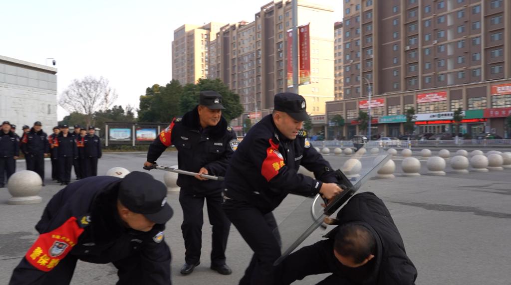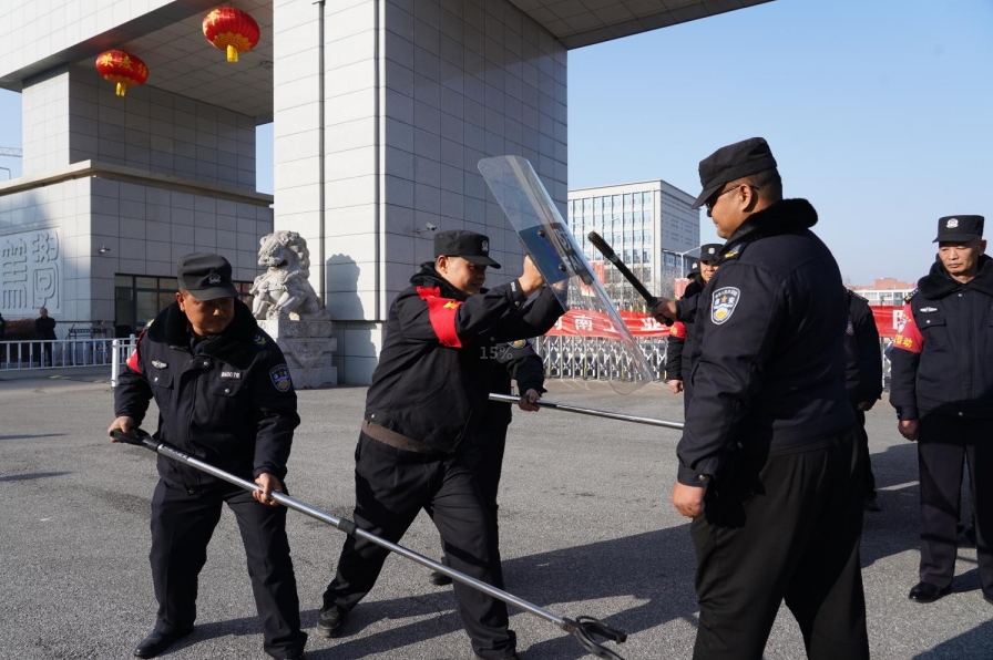 演练前,保卫处处长王存才主持召开了反恐防暴演练部署会,制定演练活动方案、布置活动场地、进行人员分工,讲解演练中的流程及注意事项。演练中,保安中队长李贞杰向校园安保人员讲解了钢叉、盾牌、警棍等器械装备的规范使用方法,提高安保人员遇到突发事件时正确的处置方法和应对能力。演练过程中,由一位保安扮演“歹徒”,在学校门口徘徊,试图强行进入校园,值班保安马上对其阻拦,让他立即离开学校,歹徒不听劝告“暴躁”地拔出凶器直冲校园。安保人员迅速到位,持械拦截,合力制服“暴恐分子”,同时拨打110报警。