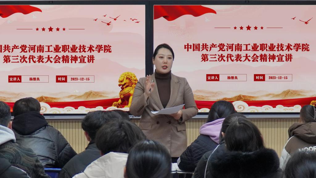 学校第三次党代会是在我校建校50周年、全力推进“双高计划”建设、积极申办本科层次职业教育的关键时刻,召开的一次十分重要的大会,是一次凝聚人心、鼓舞人心、求真务实、团结奋进的大会,吹响了学校新一轮高质量发展的进军号角,开启了新起点上学校聚焦高质量发展、提升办学层次,奋力建设新时代高水平职业大学的新征程。宣讲团成员聚焦学校党代会的主题、目标任务、规划部署、实施路径,分赴学校各基层党组织开展面向师生的对象化、分众化、互动化宣讲,精准解读学校第三次党代会精神,积极开展“两委”工作报告的学习,组织热烈讨论,引导广大师生加深理解认识、凝聚奋进力量,让学校第三次党代会精神入脑入心,取得了良好效果。