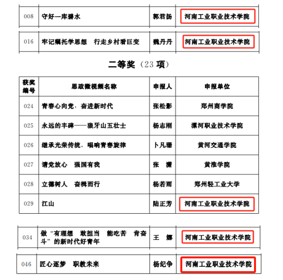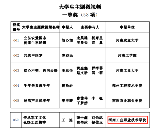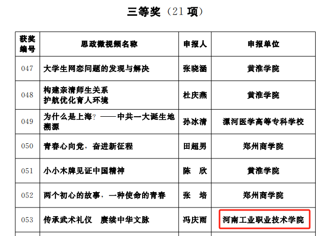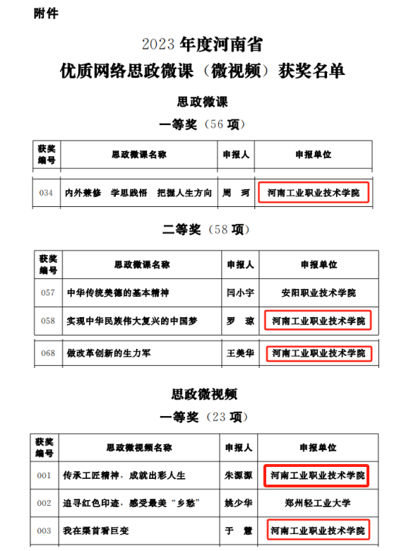 近日,河南省社会科学界联合会、共青团河南省委员会、河南省高等学校思想政治理论课教学指导委员会联合公布了2023年度河南省优质网络思政微课(微视频)获奖名单,我校思政课教师、团干部、辅导员和在校大学生共获思政微课、思政微视频、大学生主题微视频三大类奖项11项。其中,一等奖5项、二等奖5项、三等奖1项。