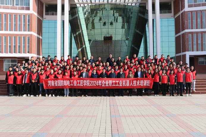 3月11日上午,河南省国防邮电工会工匠学院2024年首期培训班——企业职工工业机器人技术培训班在学校开班。河南省国防邮电工会主席杜振卿、副主席李立强,全国劳动模范、全国五一劳动奖章获得者、乐凯集团胶印版材事业部设备部经理丁峰,学校党委委员、副校长贾庆成和自动化工程学院院长胡雪梅出席开班式,开班式由继续教育学院院长丁延松主持。
