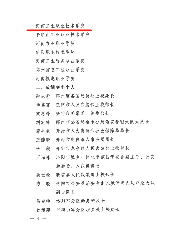 近日,河南省征兵工作领导小组下发《关于表扬河南省征兵工作成绩突出单位和个人的通报》(豫征〔2024〕2号),河南工业职业技术学院被评为河南省2023年度“征兵工作成绩突出单位”,这是我校连续第七次获得该项荣誉。