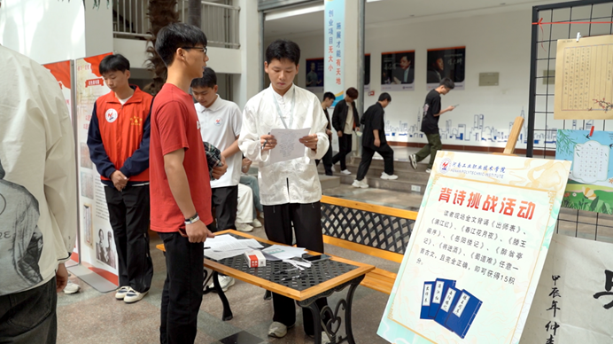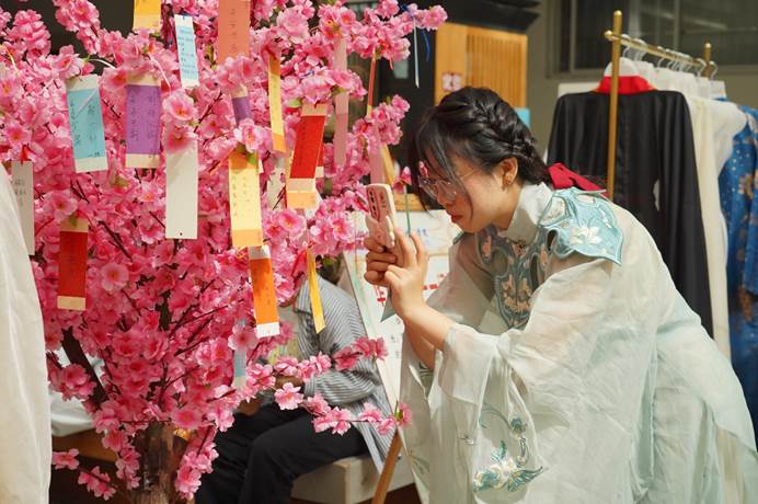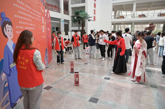 本次“古韵游艺”会设置了“笔下生花、满腹经纶、春日寻芳、华夏有衣、文韬武略、游戏文墨”六个活动区,涵盖古诗背诵挑战、手抄经典诗词、对诗大挑战、暗箱飞花、愿望清单、汉服之美、投壶等多个展位。每一个游戏环节均体现不同的诗歌元素或古风意蕴,每一展位都极富文化韵味。游园会采用集章兑奖玩法,参与者可领取一张集章明信片,在各游戏摊位前根据规则完成游戏任务,获得相应数量的印章,最后凭借印章的数量兑换文创奖品。不管是有备而来,还是乘兴而至,参与者们都表现出极大的诗歌热情和深厚的国学底蕴,文武双全,叱咤会场。背古诗、飞花令等“文”功不在话下,投壶这些“武”略也轻松应对。“古韵游艺”会在趣味诗歌游戏的精巧设计中,打开了一扇回眸诗歌、传承国学的大门,助力提升文化自信,营造书香校园。