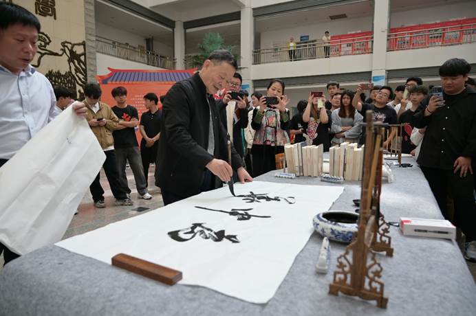 启动仪式结束后,为进一步弘扬中华传统文化,坚定文化自信,担当使命、奋发有为,共同建设中华民族现代文明,与会人员共同参与了“古韵游艺”会活动项目。著名书法家周林教授现场挥毫泼墨,为本届读书节题词:“为中华崛起而读书”,向师生展示了中国传统文化书法的瑰丽,传达着阅读与写作的精妙融合。