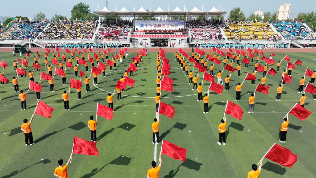 在庄严的国歌声中,五星红旗冉冉升起,全体师生面向国旗肃立并齐唱国歌。升学校校旗、第19届运动会会旗,唱校歌。