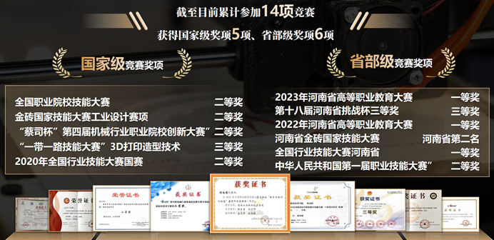 一次次竞赛,不断淬炼升华他的本领。累计获省部级以上技能竞赛奖励11项,特别是在2023年全国职业院校技能大赛-数字化设计与制造比赛中,他负责逆向建模、模型装配等工作,持续备赛16个月,制作模型2大纸箱。最终获得河南省赛第1名、国赛第8名。