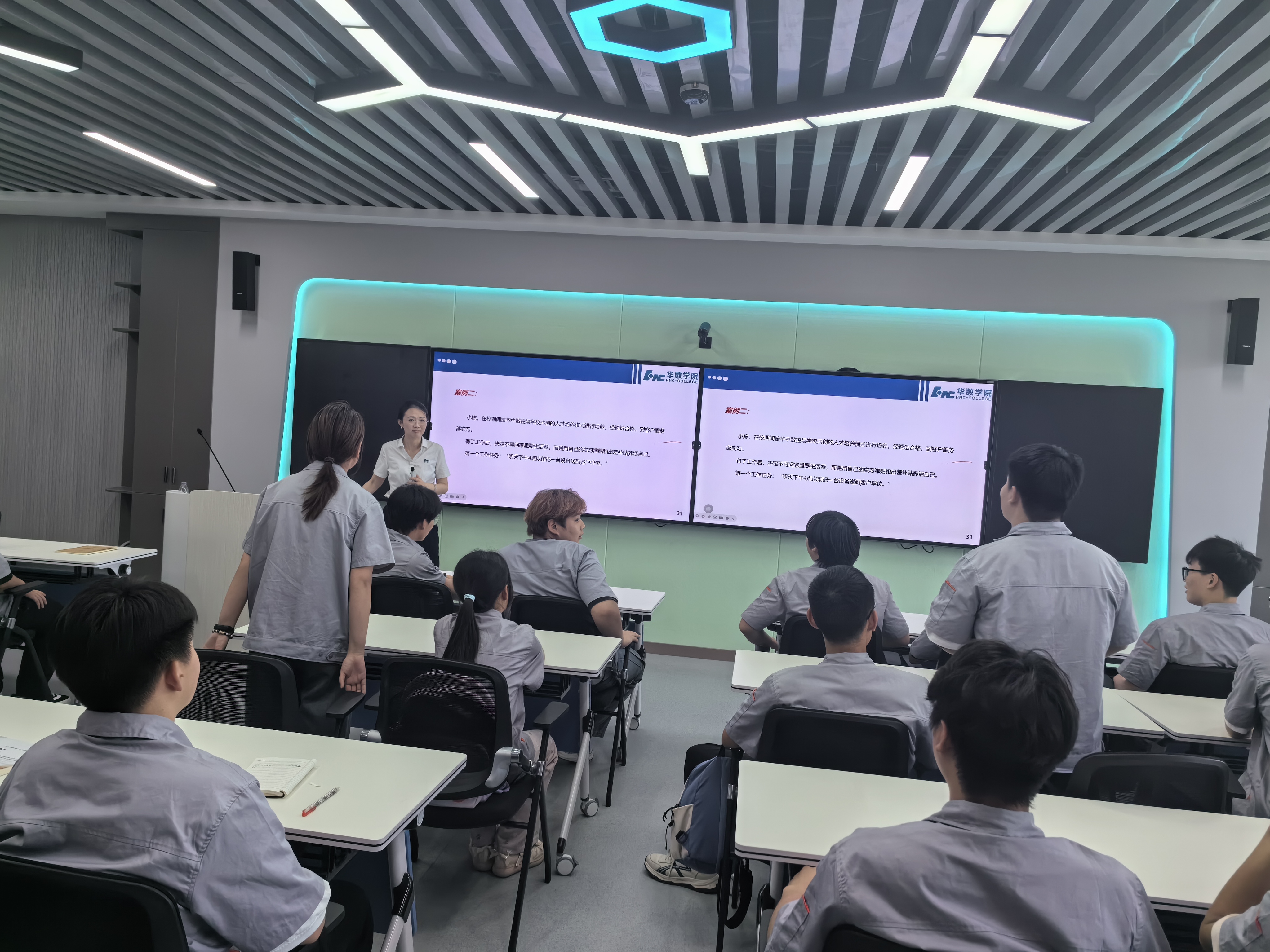 徐睿老师在L2506教室以智能制造行业现场工程师为例,以“构建自我认知,解锁职场潜能”为主题,为学生们讲解《企业文化》课程,从优秀现场工程师成长案例、现场工程师职业成长发展路径、解锁现场工程师职业发展潜能三个方面引导学生构建“稳定清晰、敏而敦行”的自我认知、“耐得住性子、人在事上练”的自我认同,“调用系统、持续更新”的自我发展,通过小组讨论、现场演绎企业工程案例的方式,极大调动了学生们的现场参与度和职场认同感。