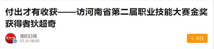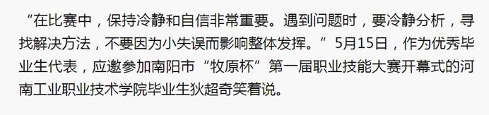 编者按:在南阳市“牧原杯”第一届职业技能大赛举办之际,为进一步弘扬劳动光荣、技能宝贵、创造伟大的时代风尚,5月16日,南阳日报、南阳晚报等媒体分别以《付出才有收获》《青春奋斗绽芳华》为题,对我校学生狄超奇、鞠先峰,深钻细研技术技能的奋进姿态,精益求精勇攀高峰的进取精神,以及荣获河南省第二届职业技能大赛金奖的事迹进行宣传报道,激励了更多青年学子走技能成才、技能报国之路,用奋斗书写人生出彩华章。(供稿/党委宣传部 撰稿/杨纪争 单位审核/赵国峰 编审/杨爽)