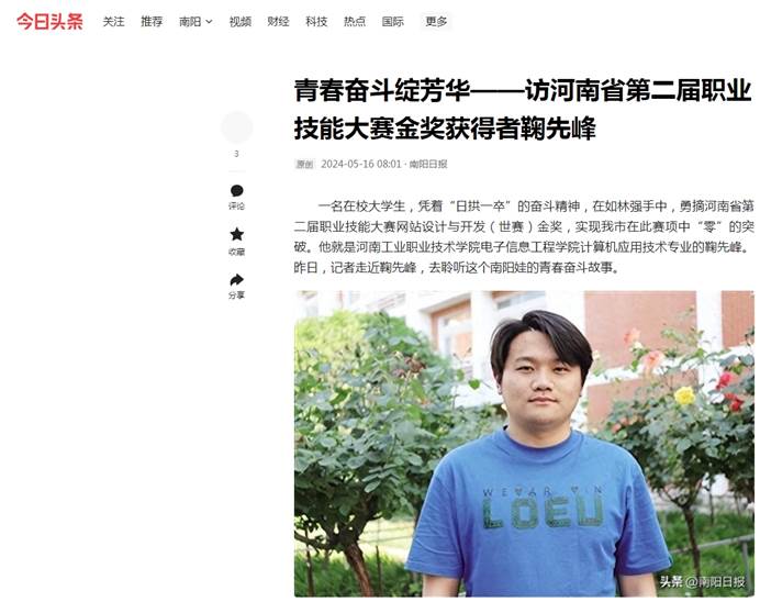 一名在校大学生,凭着“日拱一卒”的奋斗精神,在如林强手中,勇摘河南省第二届职业技能大赛网站设计与开发(世赛)金奖,实现我市在此赛项中“零”的突破。他就是河南工业职业技术学院电子信息工程学院计算机应用技术专业的鞠先峰。昨日,记者走近鞠先峰,去聆听这个南阳娃的青春奋斗故事。
