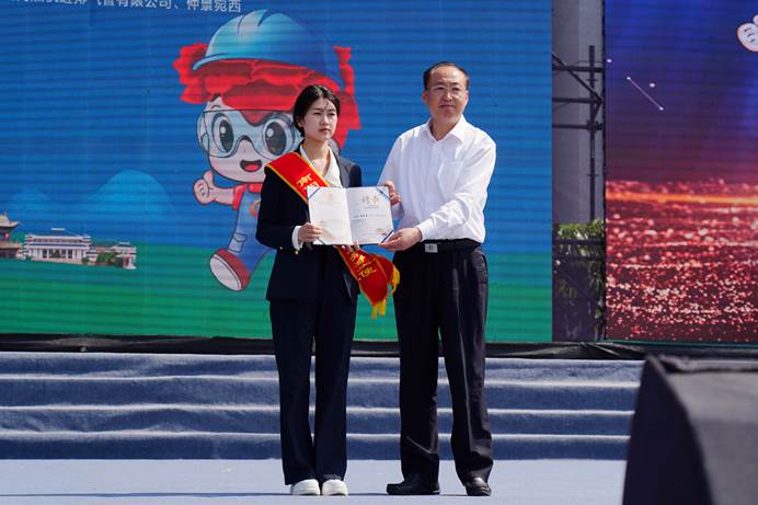 南阳市人力资源和社会保障局党组书记、局长郝以昆为世界技能大赛冠军姜雨荷颁发“南阳市技能人才公益形象大使”荣誉证书。