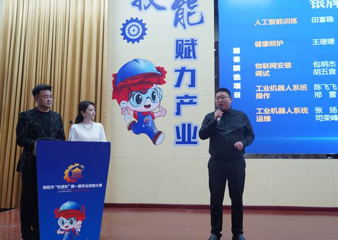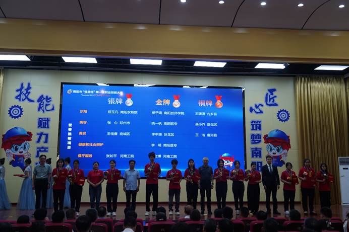 南阳市人民政府副秘书长唐荣涛、南阳市人力资源和社会保障局局长郝以昆、南阳市人力资源和社会保障局副局长屈云霞、南阳市教育局副局长贺晨辉、南阳市妇联副主席王琪、市总工会劳动和经济工作部部长靳涛、共青团南阳市委副书记王庆峰和我校校长屈保中出席并为获奖个人和集体颁奖。各参赛队伍、获奖选手代表共300余人参加闭幕式。
