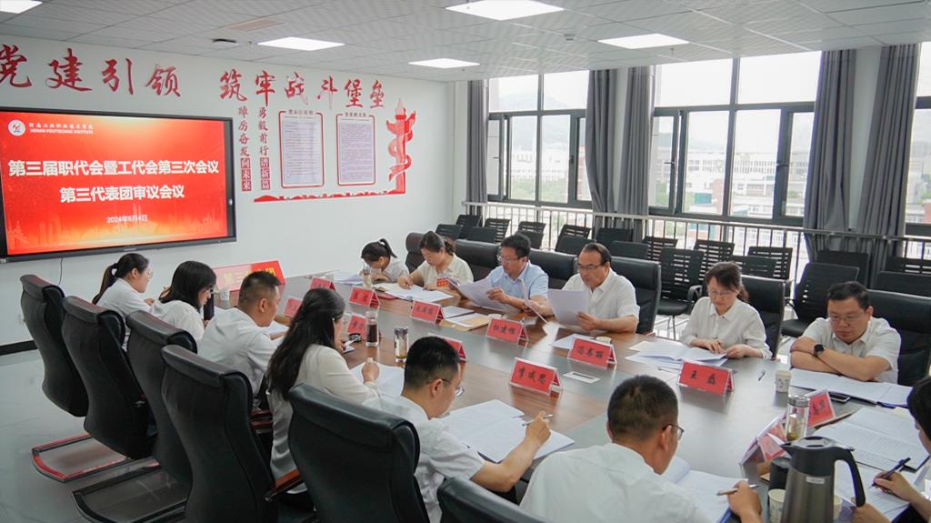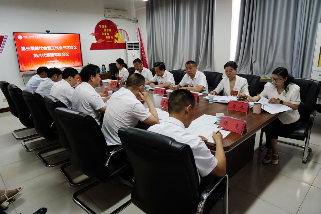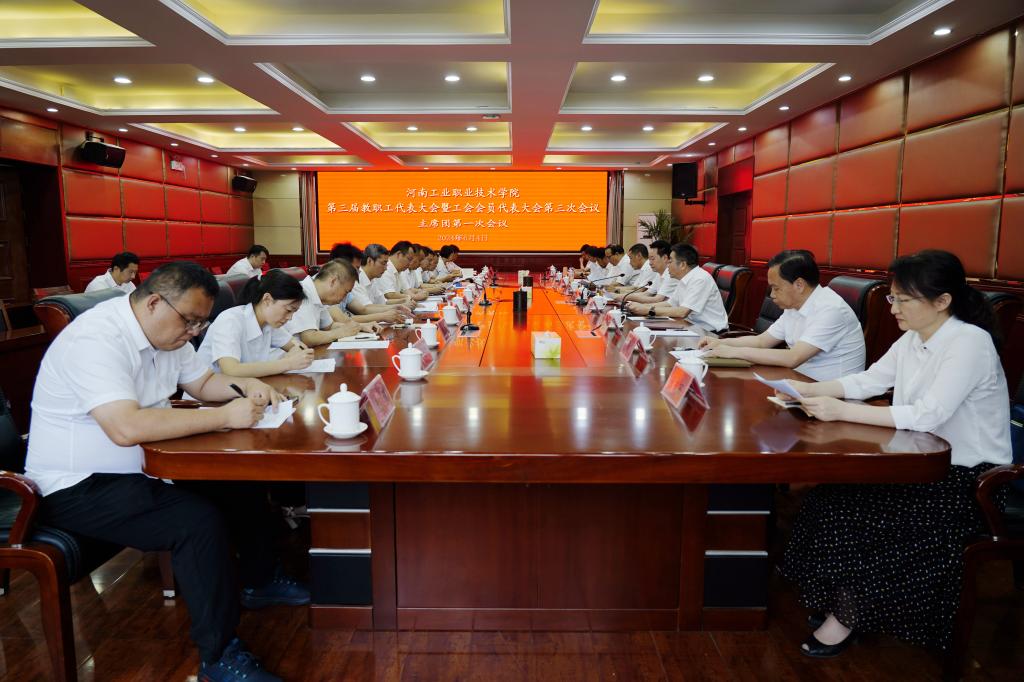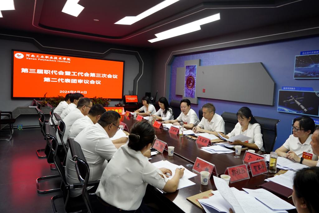 下午15点30分,大会主席团全体成员在办公楼第四会议室召开主席团第二次会议,听取八个代表团团长对审议事项的讨论情况汇报,表决通过了《河南工业职业技术学院第三届教职工代表大会暨工会会员代表大会第三次会议决议》(草案)。