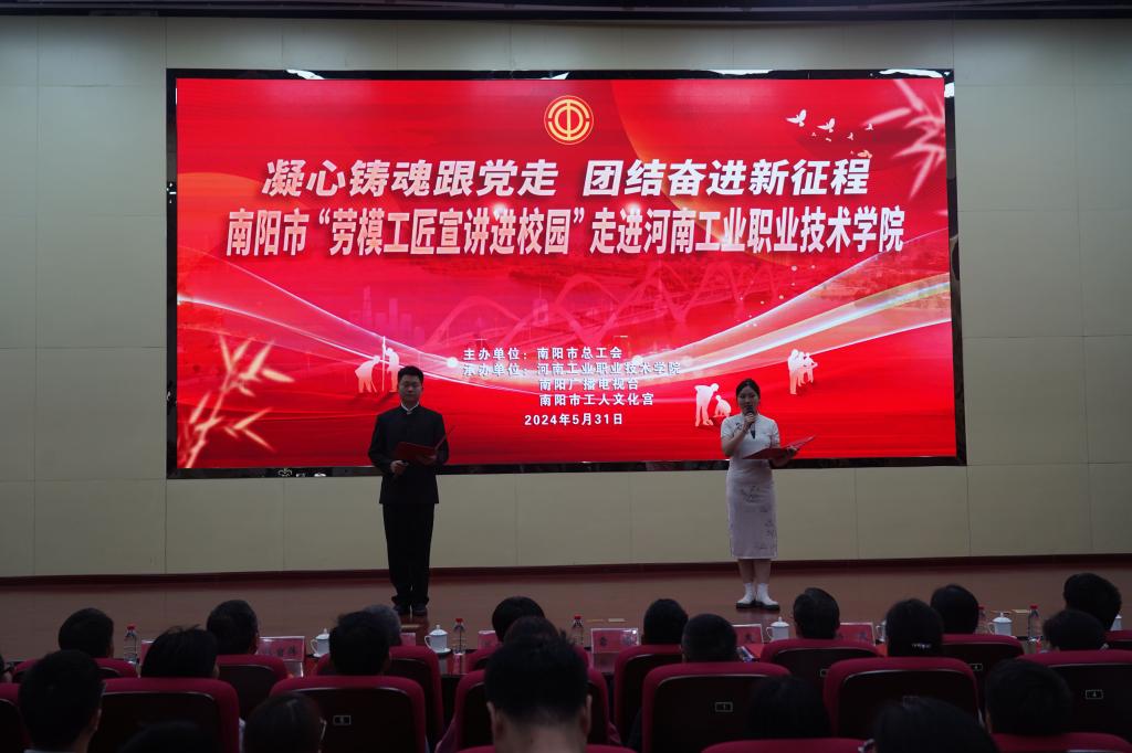 5月31日下午,由南阳市总工会主办的“劳模工匠宣讲进校园”活动在我校大学术报告厅举行,活动邀请全国先进工作者郭春鹏、全国劳动模范杜岩伟、全国五一劳动奖章获得者李力、 河南省劳动模范吕效果作宣讲,学校近三百名师生参加。南阳市总工会宣教部部长雷鸣出席活动,学校工会、宣传部、团委等部门相关同志参加了活动。