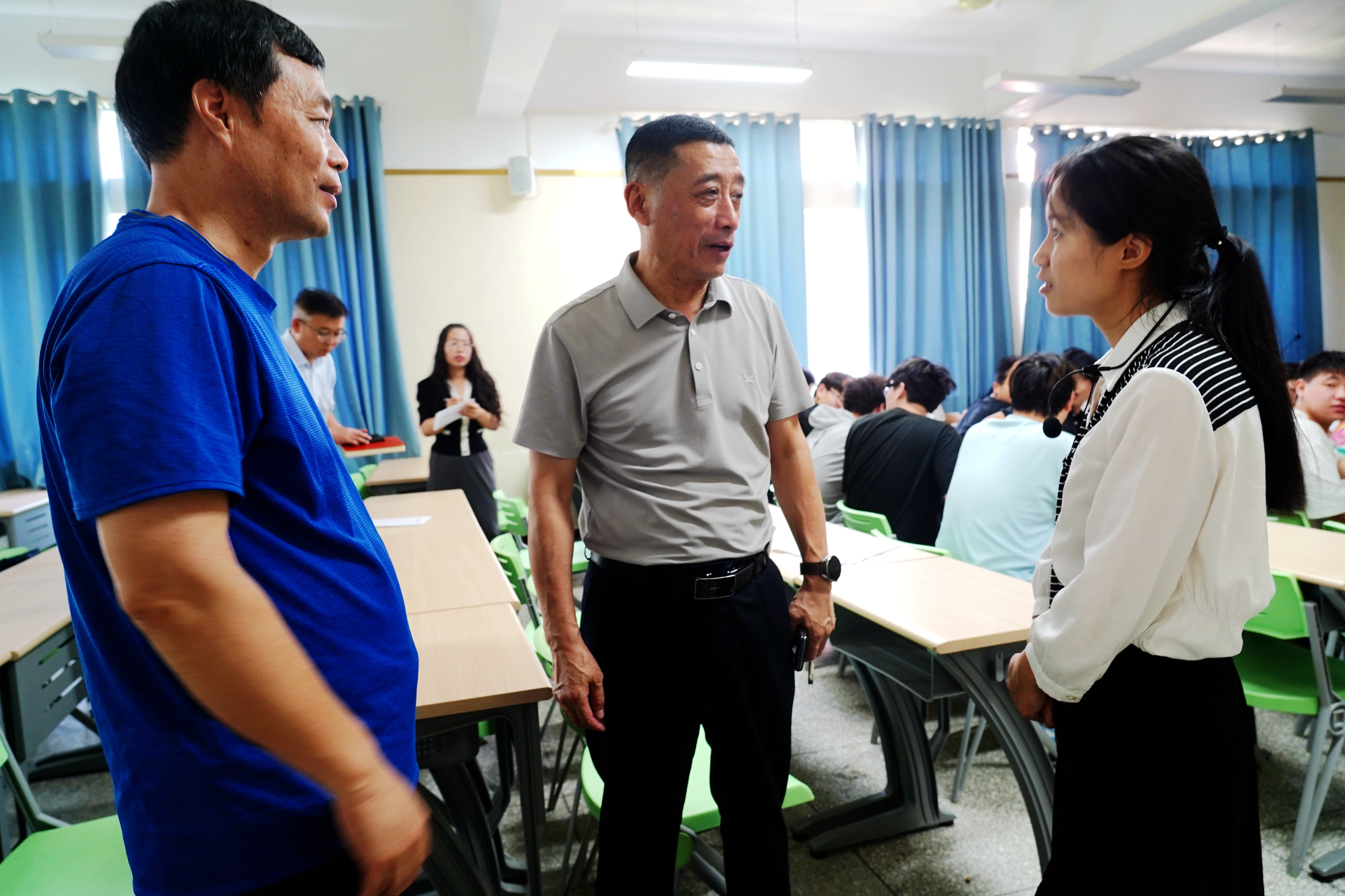 课堂上,梁丹以《建设什么样的生态文明》为主题,系统讲授了“人与自然和谐共生的现代化”“绿水青山就是金山银山”“新时代生态文明建设的辉煌成就”三个方面的内容。帮助同学们正确理解把握新时代生态文明建设新理念新思想,引导青年学生提升生态文明意识,能够以习近平生态文明思想指导自己的思想和行为,用青春力量共同建设美丽中国。王伟、樊有平对课堂讲授的内容进行了详细记录,并细心观察同学们的精神风貌和学习状态。课后与梁丹老师进行了亲切交谈。