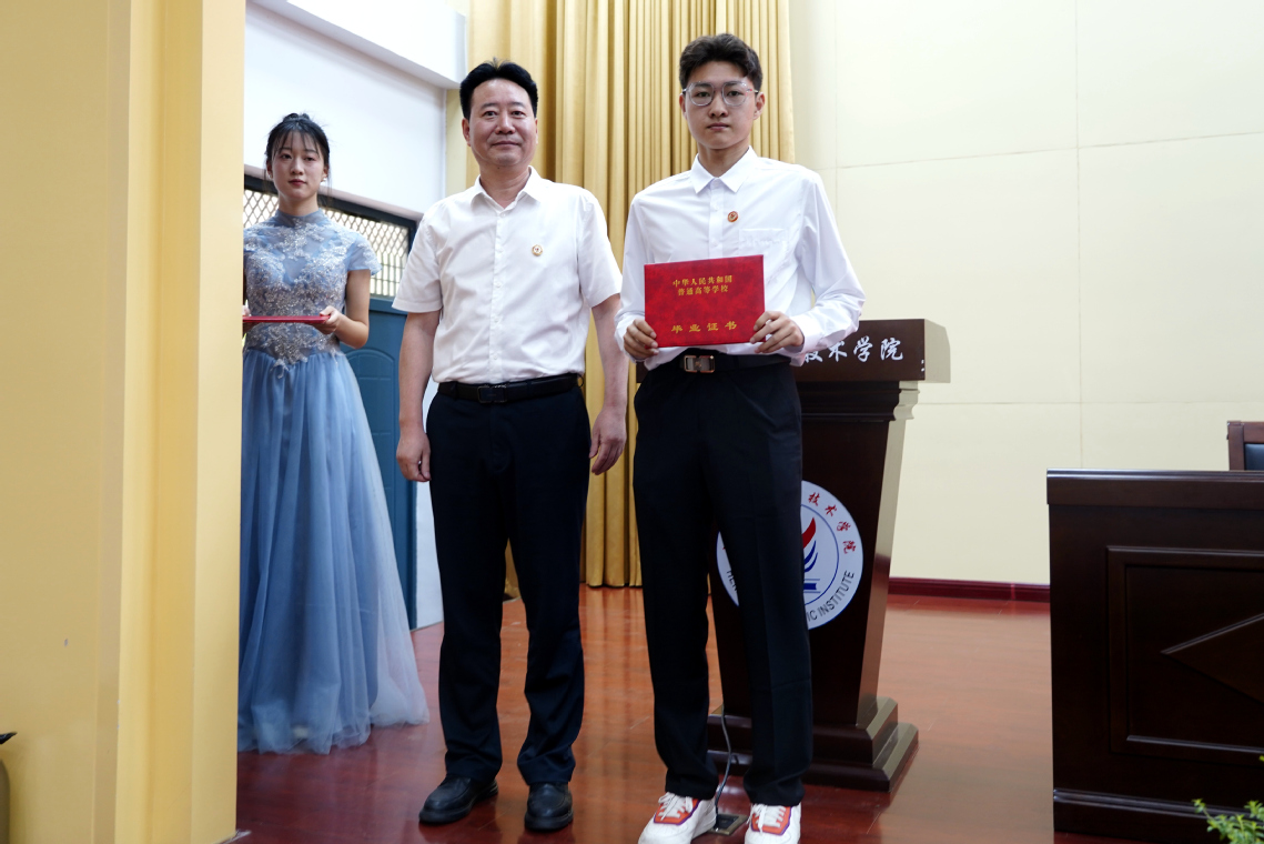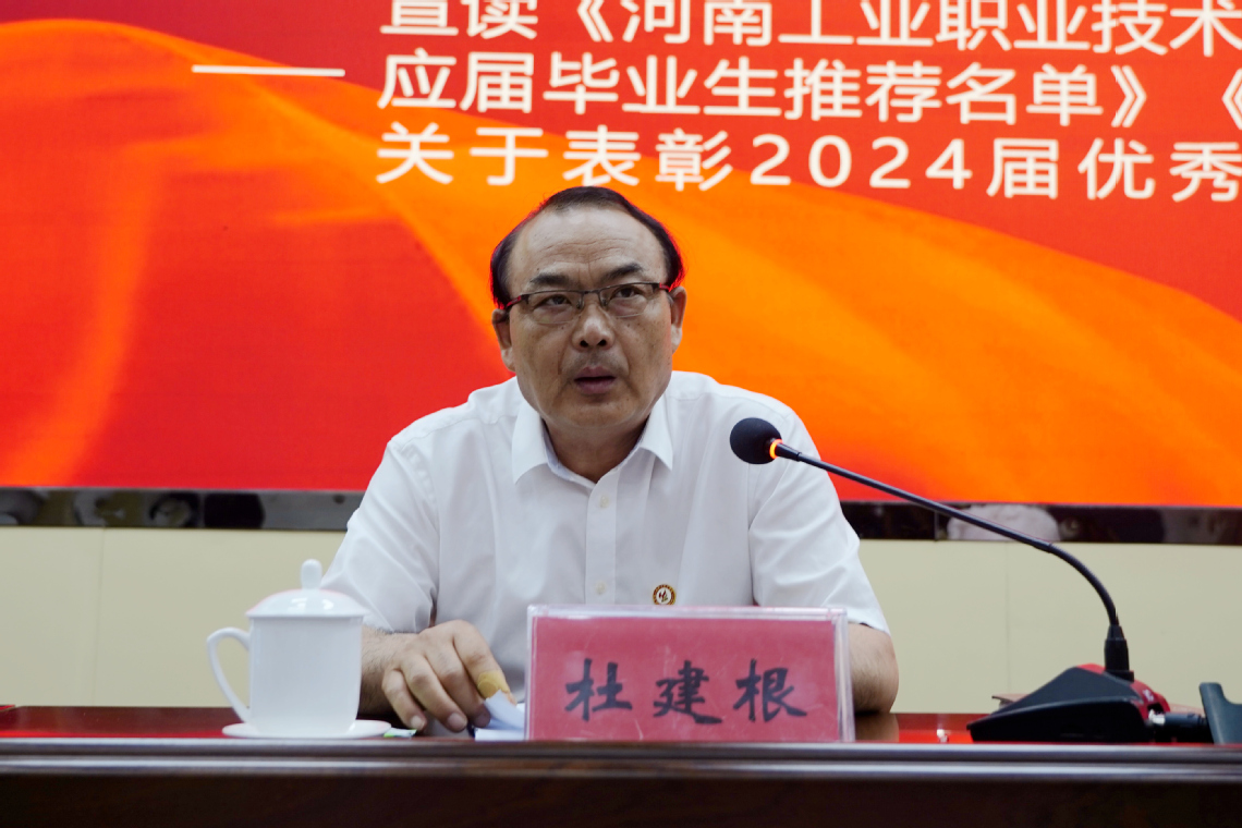 毕业典礼在雄壮的国歌声中拉开帷幕。副校长贾庆成介绍了2024届毕业生情况;党委副书记杜建根宣读了《河南工业职业技术学院关于表彰2024届优秀应届毕业生的决定》《河南工业职业技术学院2024年河南省优秀应届毕业生推荐名单》。在激昂欢快的乐曲声中,与会领导为2024届省级优秀毕业生、校级优秀毕业生代表颁发了荣誉证书。