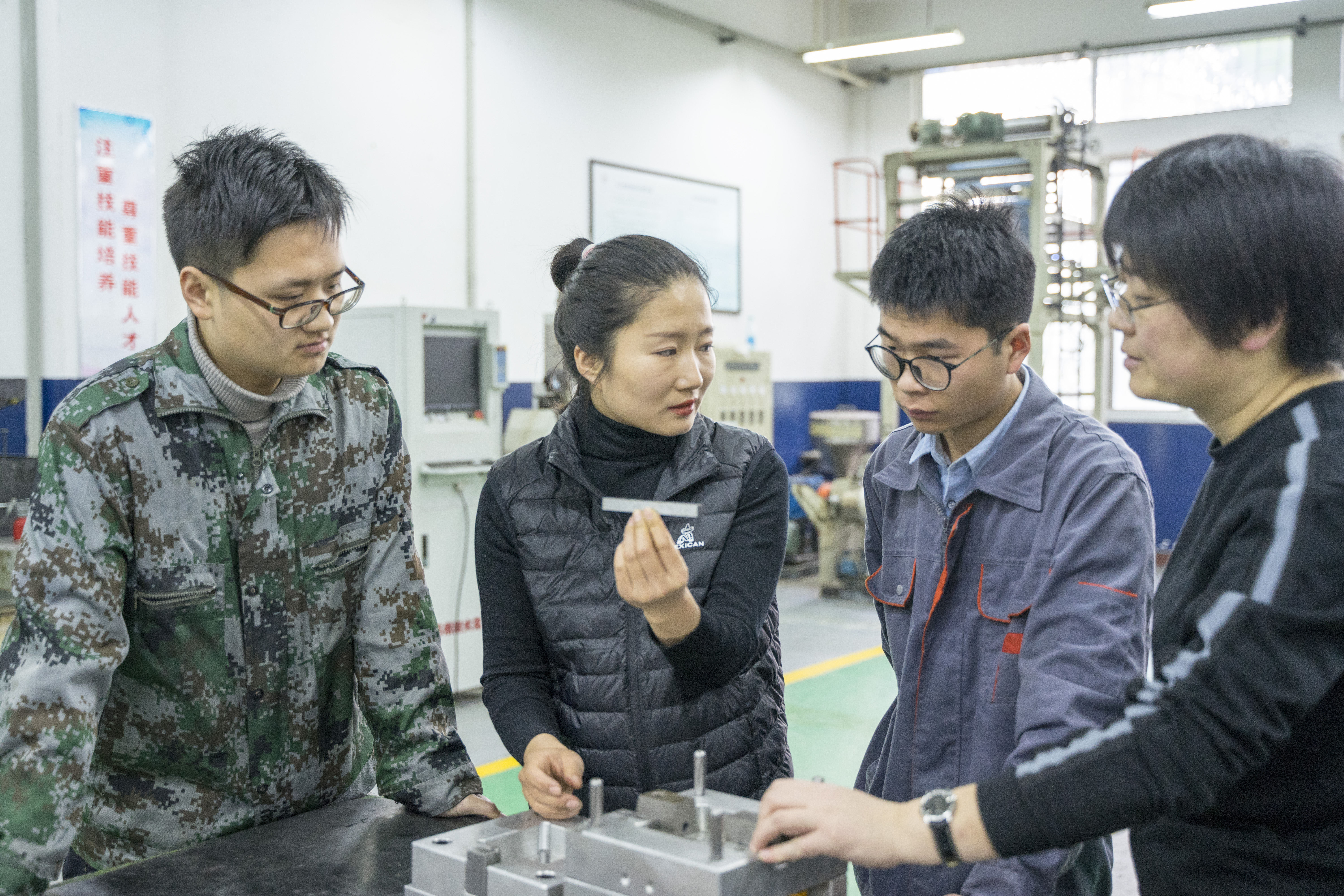 这一幕,是孙老师正在给我们参加模具数字化设计与制造工艺大赛的同学,讲解模具成型零件设计与制造细节的场景,我从一名粗心的学生,逐渐去领悟谨慎、细致、创新的匠人品质。在备战全国职业院校技能大赛过程中,我懂得了时间的珍贵,懂得了坚守坚持创新,懂得了制造强国的途径与意义。机器轰鸣,钢铁飞屑,自信伴随着能力不断提升,强国有我,匠心筑梦!