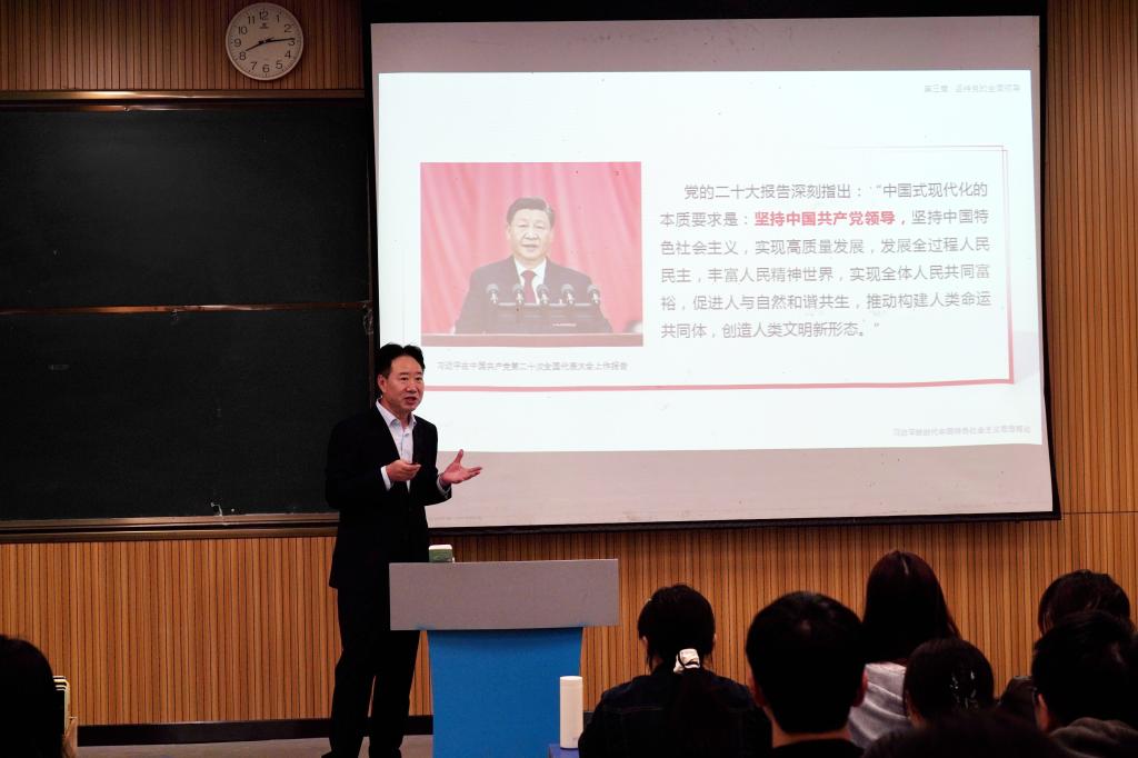 为深入贯彻落实党的二十届三中全会和全国教育大会精神,落实《领导干部上讲台开展思想政治教育工作实施方法》系列要求,全面推进新时代学校思政课建设,10月17日上午,学校校长屈保中在孔明路校区X4101教室,为大数据2301班和2302班讲授《习近平新时代中国特色社会主义思想概论》课。
