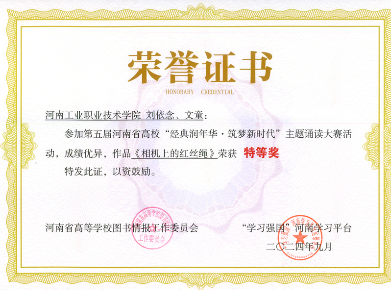 本次大赛是在河南省教育厅高等教育处指导下,由河南省高校图书情报工作委员会和“学习强国”河南学习平台联合主办。我校图书馆积极响应大赛号召,通过精心策划和广泛宣传,激发了广大师生的参与热情,共遴选出15件优秀作品参加省级决赛评选。经大赛组委会评审,最终我校推送的优秀作品获得教师组二等奖1项,三等奖1项;学生组特等奖1项,一等奖2项,二等奖1项,三等奖2项。其中刘依念、文童的作品《相机上的红丝绳》入选“学习强国”河南学习平台,并在平台进行展播,进一步扩大了我校的影响力。