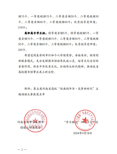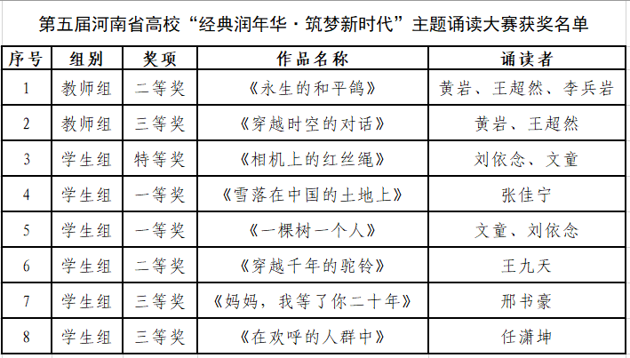 近日,由河南省高等学校图书情报工作委员会、“学习强国”河南学习平台主办的第五届河南省高校“经典润年华·筑梦新时代”主题诵读大赛获奖名单揭晓,我校凭借卓越的表现再获佳绩,展现了深厚的文化底蕴和蓬勃的文化活力。