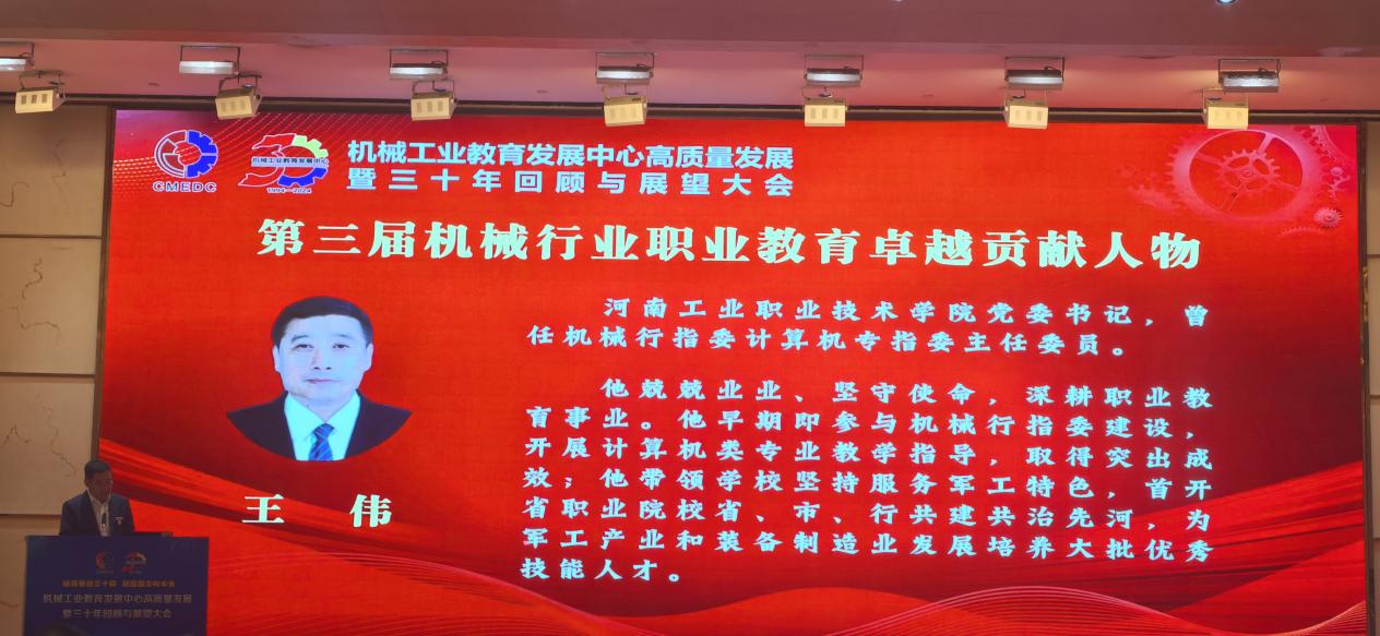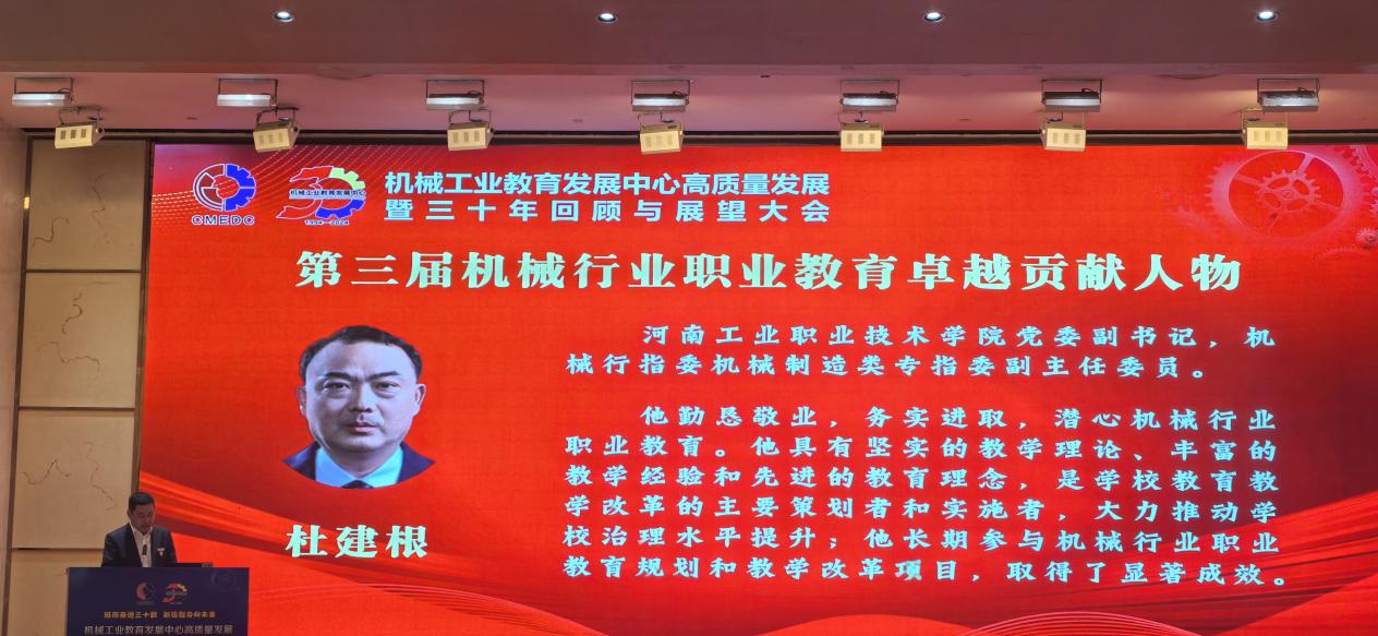 为深入贯彻落实党的二十大和党的二十届三中全会精神,进一步发挥人才在服务机械工业高质量发展、建设制造强国中的战略支撑作用,增强面向未来的持续健康发展能力,10月20日,机械工业教育发展中心在北京举办“砥砺奋进三十载,新质服务向未来--机械工业教育发展中心高质量发展大会暨三十年回顾与展望”,学校党委书记王伟、党委副书记杜建根应邀参加并被授予第三届“机械行业职业教育卓越贡献人物”殊荣,学校原党委书记温道军应邀参加并受聘为机械工业教育发展中心专家委员会委员。