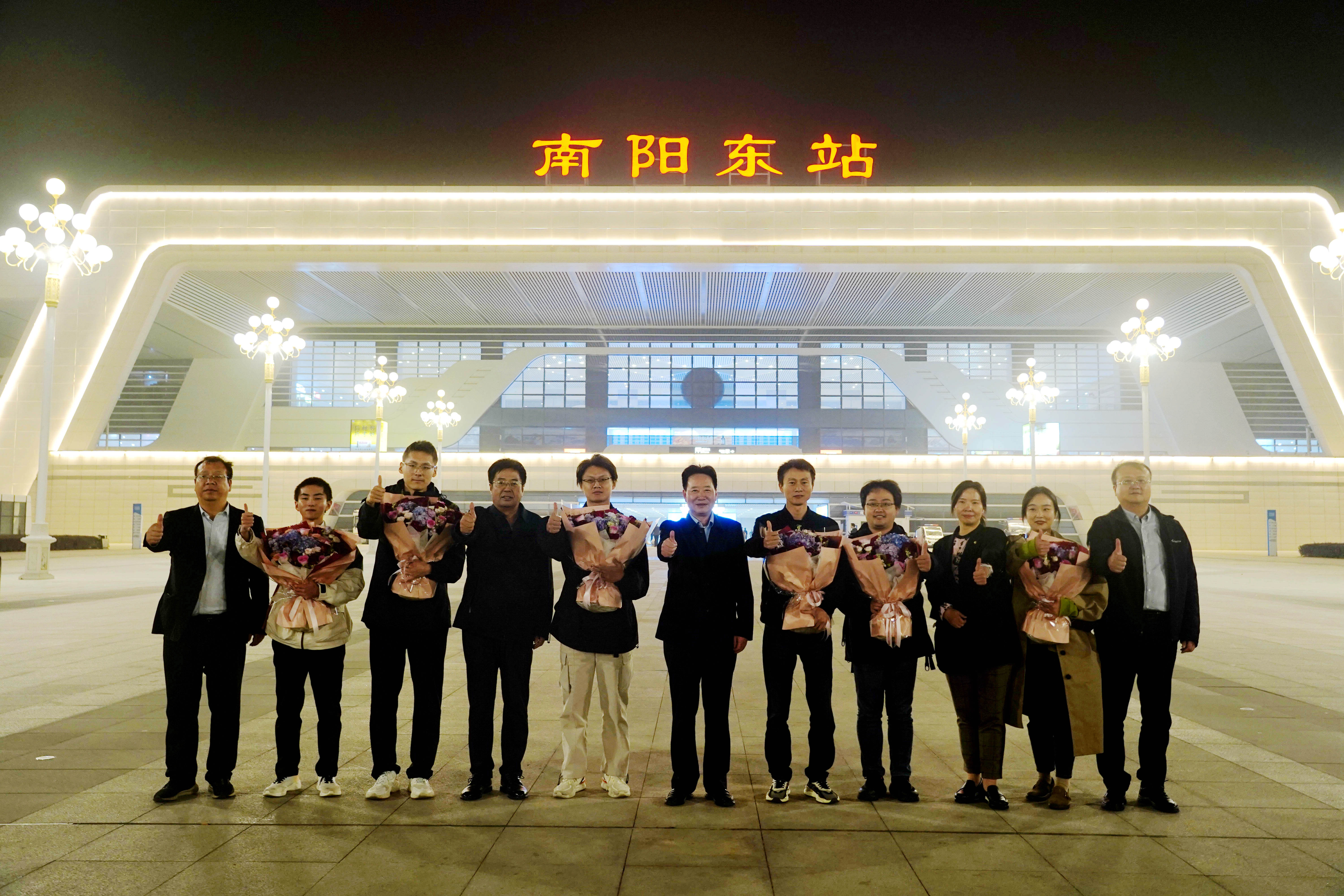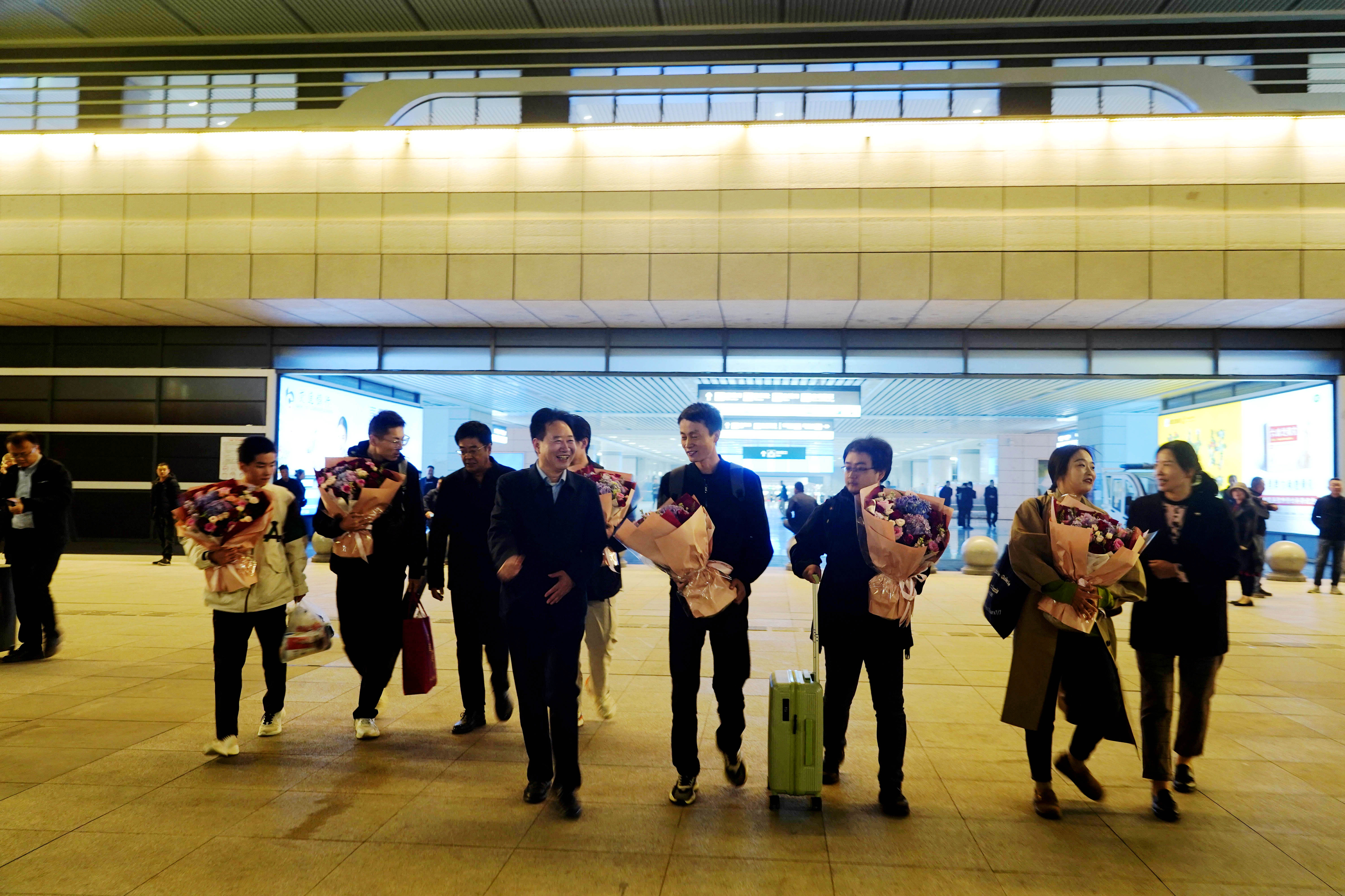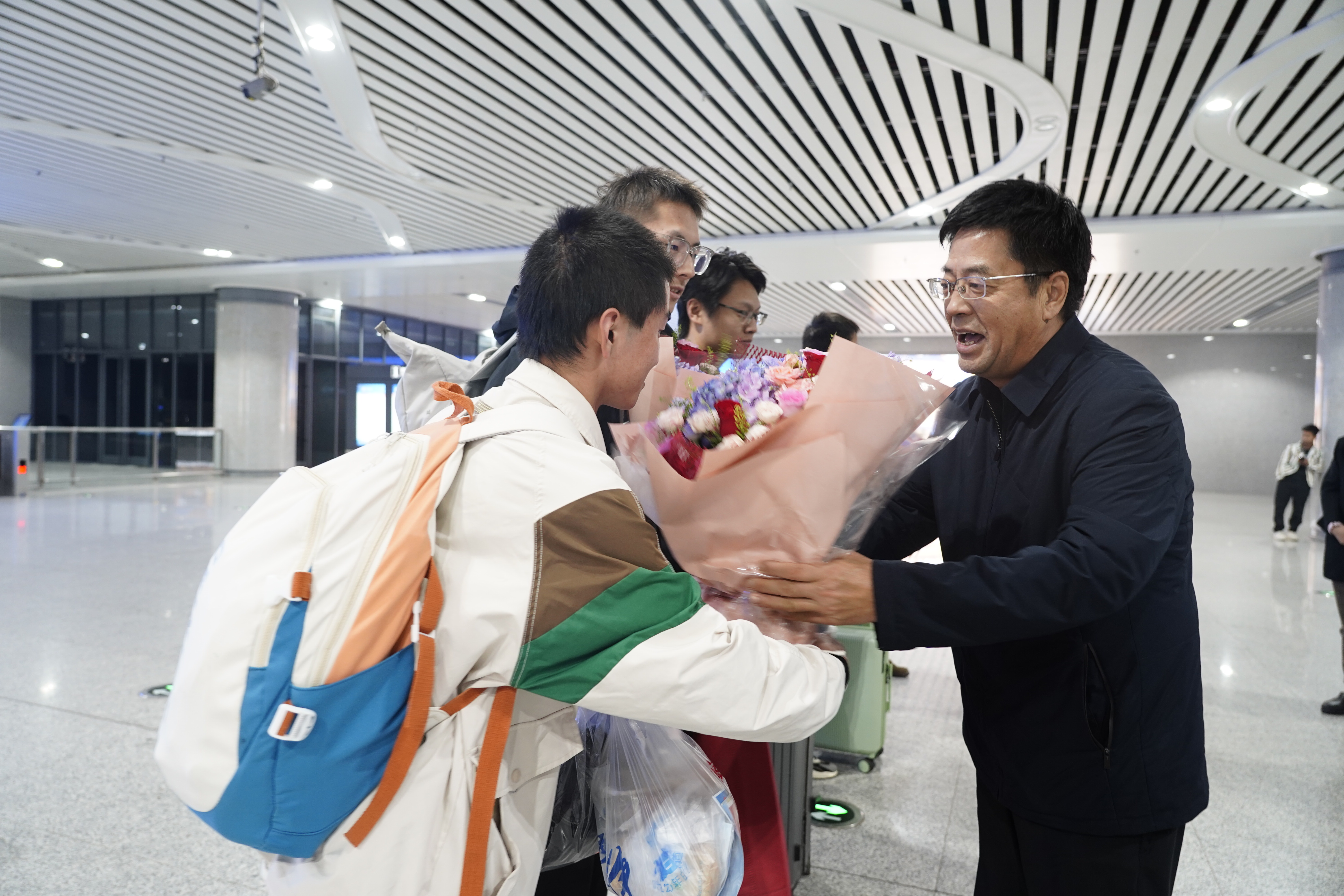 迎接队伍早早地来到了南阳高铁站,手捧鲜花,满怀期待地等待着获奖师生的归来。在迎接现场,屈保中、贾庆成亲自上前送上鲜花,与团队师生一一握手并亲切交流,对他们的辛勤付出和取得的优异成绩表示热烈的祝贺和衷心的感谢,大家共同分享喜悦时刻。