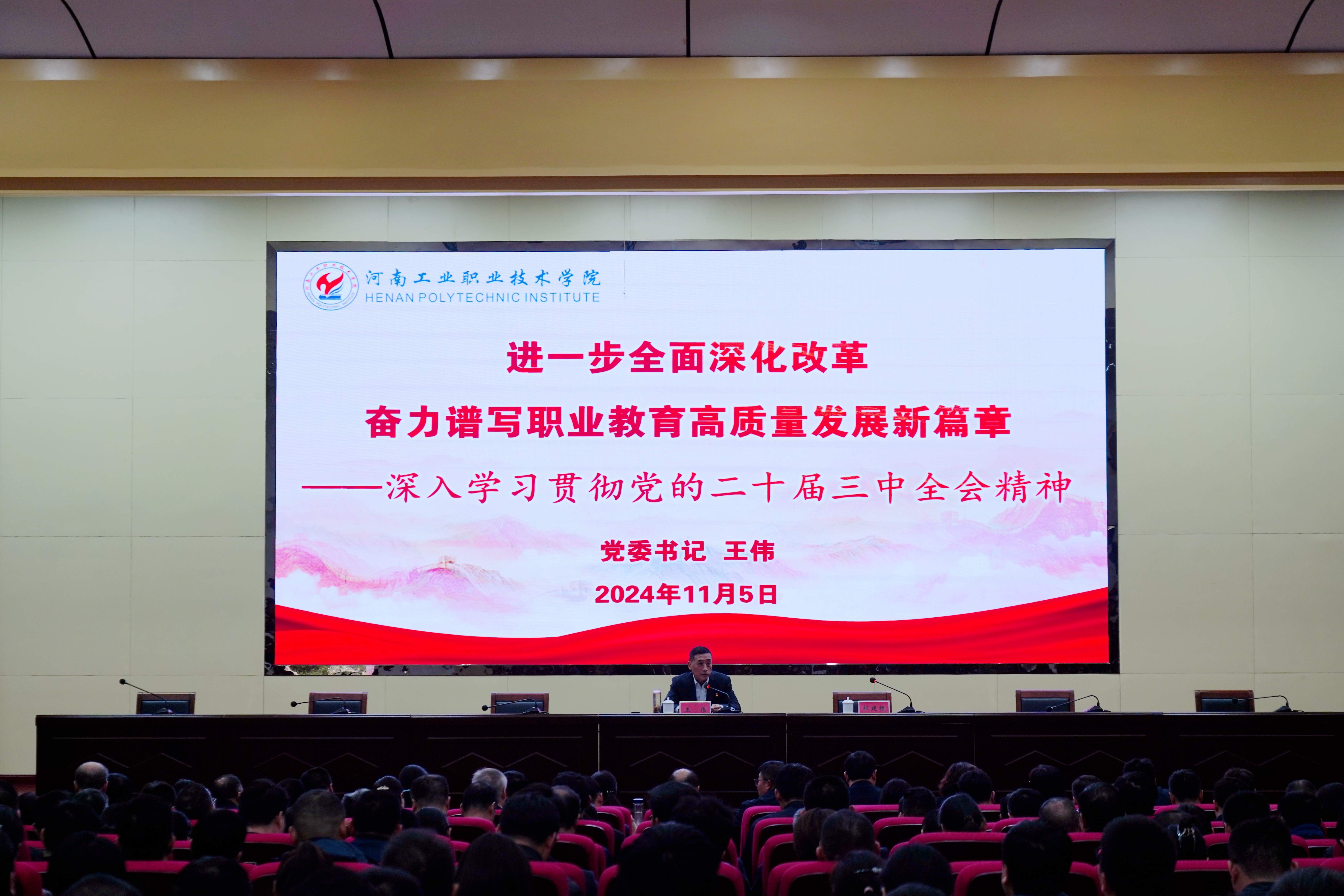 王伟以《进一步全面深化改革,奋力谱写职业教育高质量发展新篇章》为题,围绕“深刻认识党的二十届三中全会的重大意义”“深入学习领会习近平总书记在党的二十届三中全会上的重要讲话精神”“全面准确理解《决定》提出的进一步全面深化改革重大举措”“全力以赴抓好全会精神贯彻落实,奋力谱写职业教育高质量发展新篇章”四个方面,深入阐述了党的二十届三中全会的重大意义、重大举措,全面解读了《中共中央关于进一步全面深化改革、推进中国式现代化的决定》的重要内容。