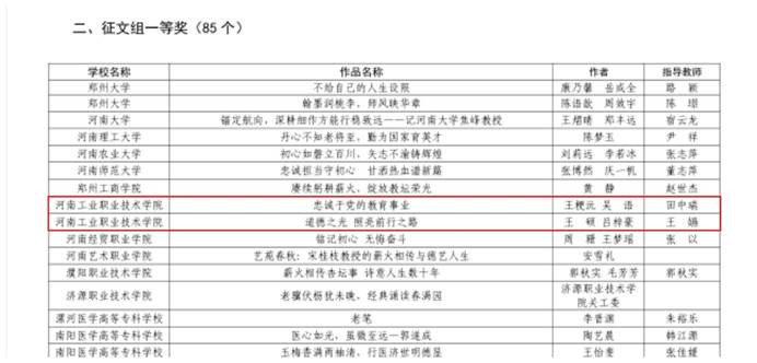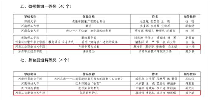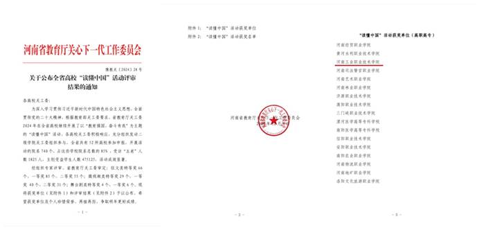 近日,教育部关工委和河南省教育厅关工委陆续发文公布全国高校和河南省属高校2024年“读懂中国”活动获奖名单。我校推荐的征文、微视频和舞台剧在省教育厅关工委评选中全部入选,其中2篇征文获省一等奖,1部微视频获省一等奖,1部舞台剧获省特等奖。教育部关工委对我校予以表扬。
