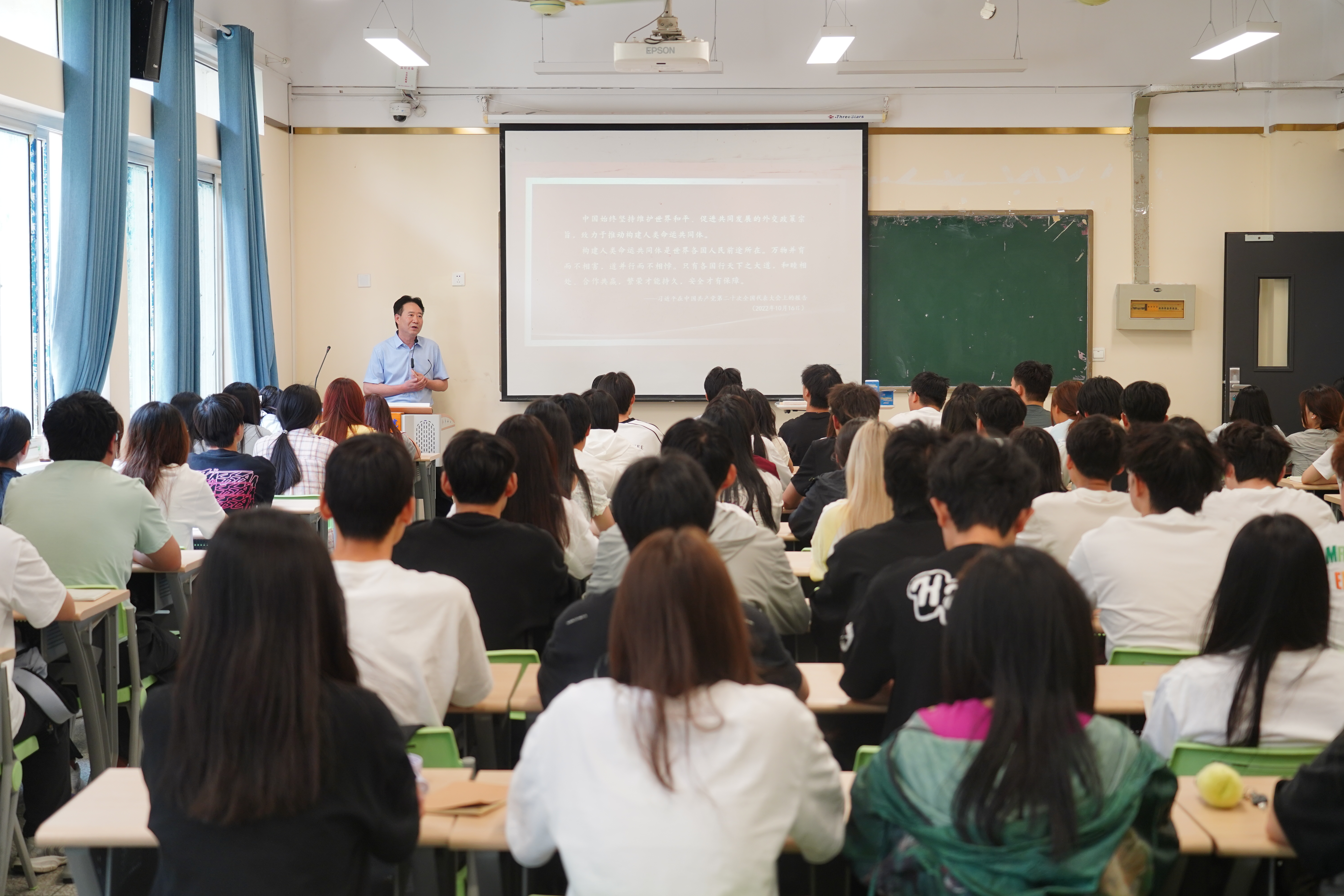 为深入贯彻落实党的二十届三中全会和全国教育大会精神,落实《领导干部上讲台开展思想政治教育工作实施方法》系列要求,全面推进新时代学校思政课建设,坚持不懈用习近平新时代中国特色社会主义思想铸魂育人,5月28日下午,学校校长屈保中在孔明校区X1206教室,为计算机应用2401班、2402班讲授《习近平新时代中国特色社会主义思想概论》课。