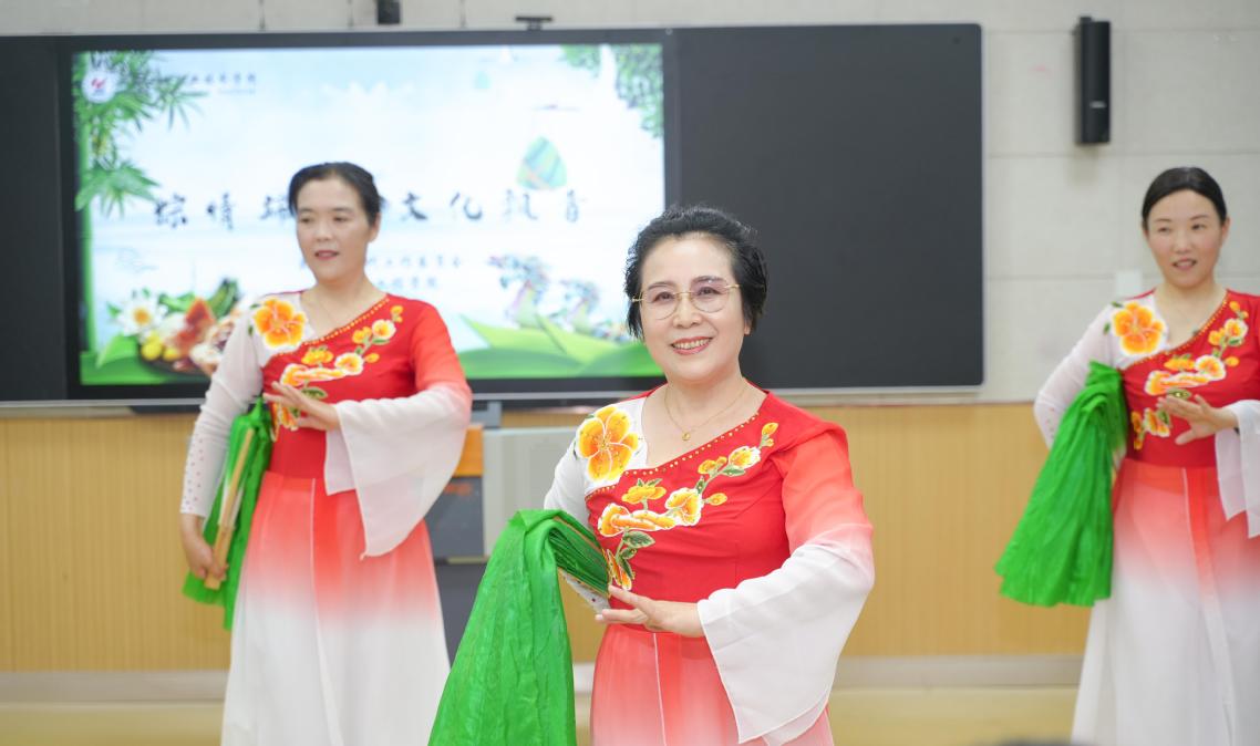 在等待粽子煮熟的间隙,精彩的节目表演轮番登场。张宛玲、张红老师献唱《春风十万里》,在明快旋律中传递出新时代的蓬勃生机;孙章恺同学朗诵的《大写的中国》,以铿锵语调描绘祖国壮丽画卷,引发全场共鸣;教职工舞蹈协会带来的《第五套健身秧歌》,将传统民俗与健身运动结合,舞步灵动间尽显风采;刘烨同学的笛子独奏《女儿情》婉转悠扬;学校退休教师的《八段锦》展演则刚柔并济,展现传统养生文化魅力;学生们的戏曲串烧巧妙融合现代元素,让古老戏曲迸发新活力。台上,银发教师稳健从容,青年学子朝气蓬勃;台下,掌声雷动,欢呼声此起彼伏,传统文化在代际碰撞中绽放新光彩。