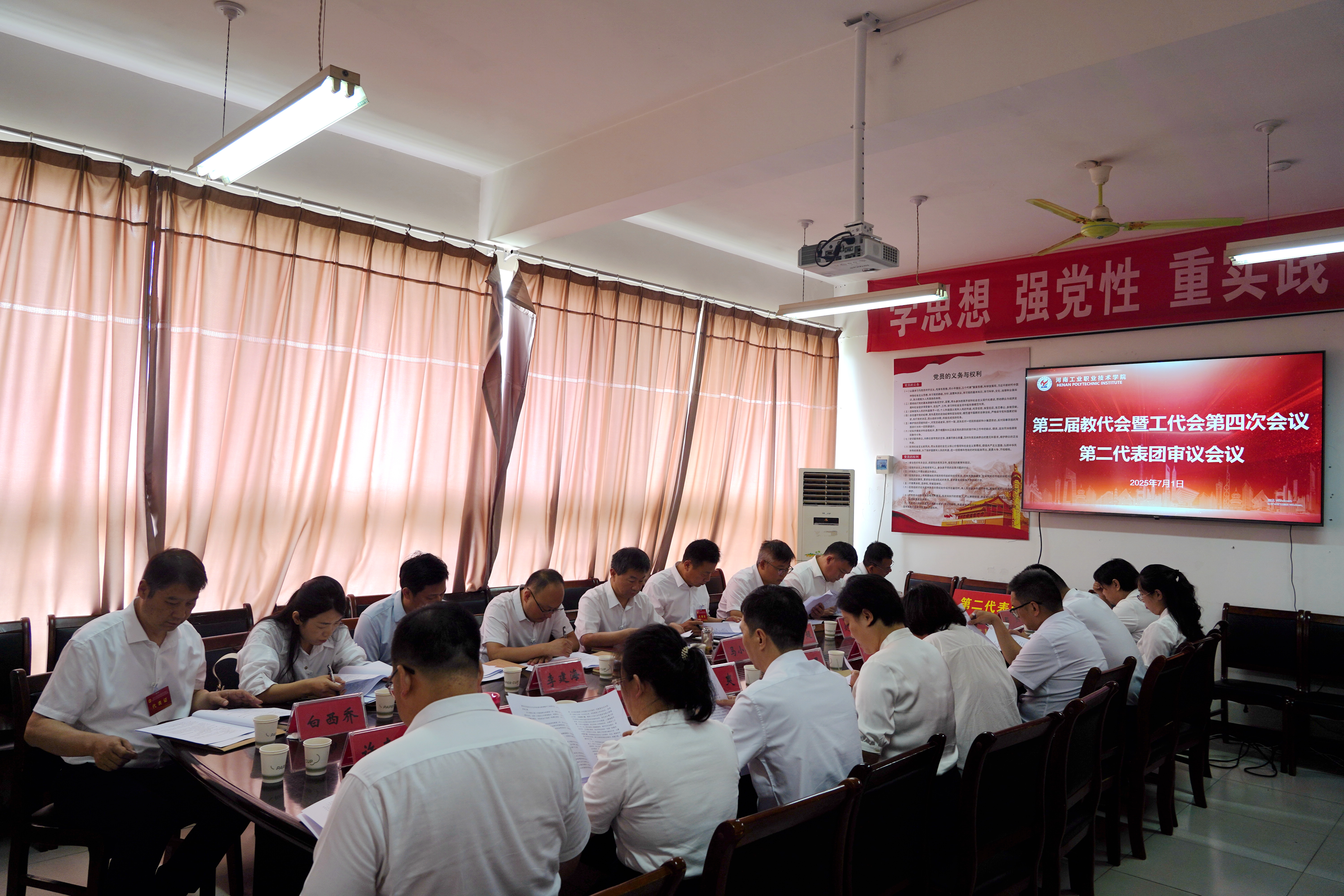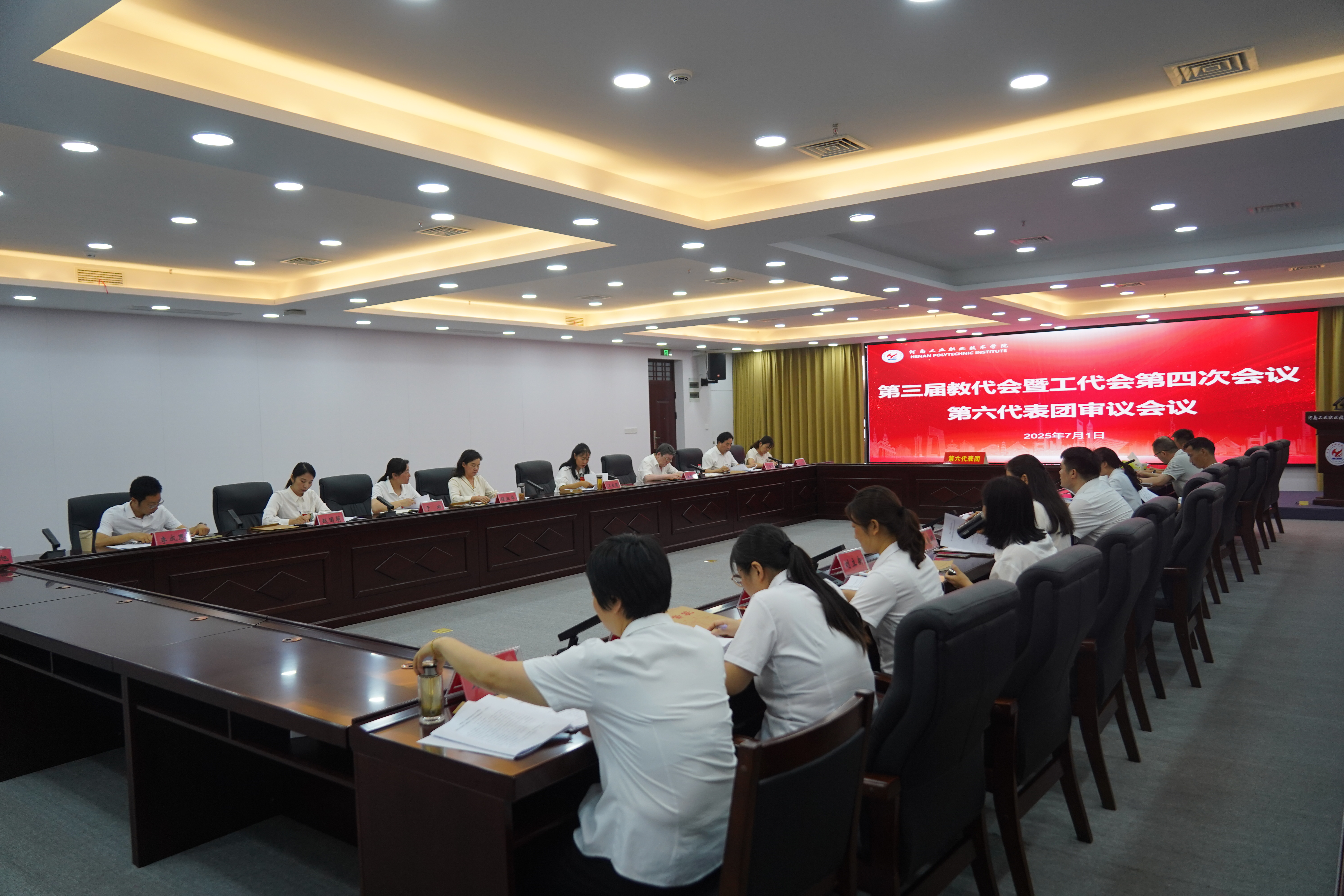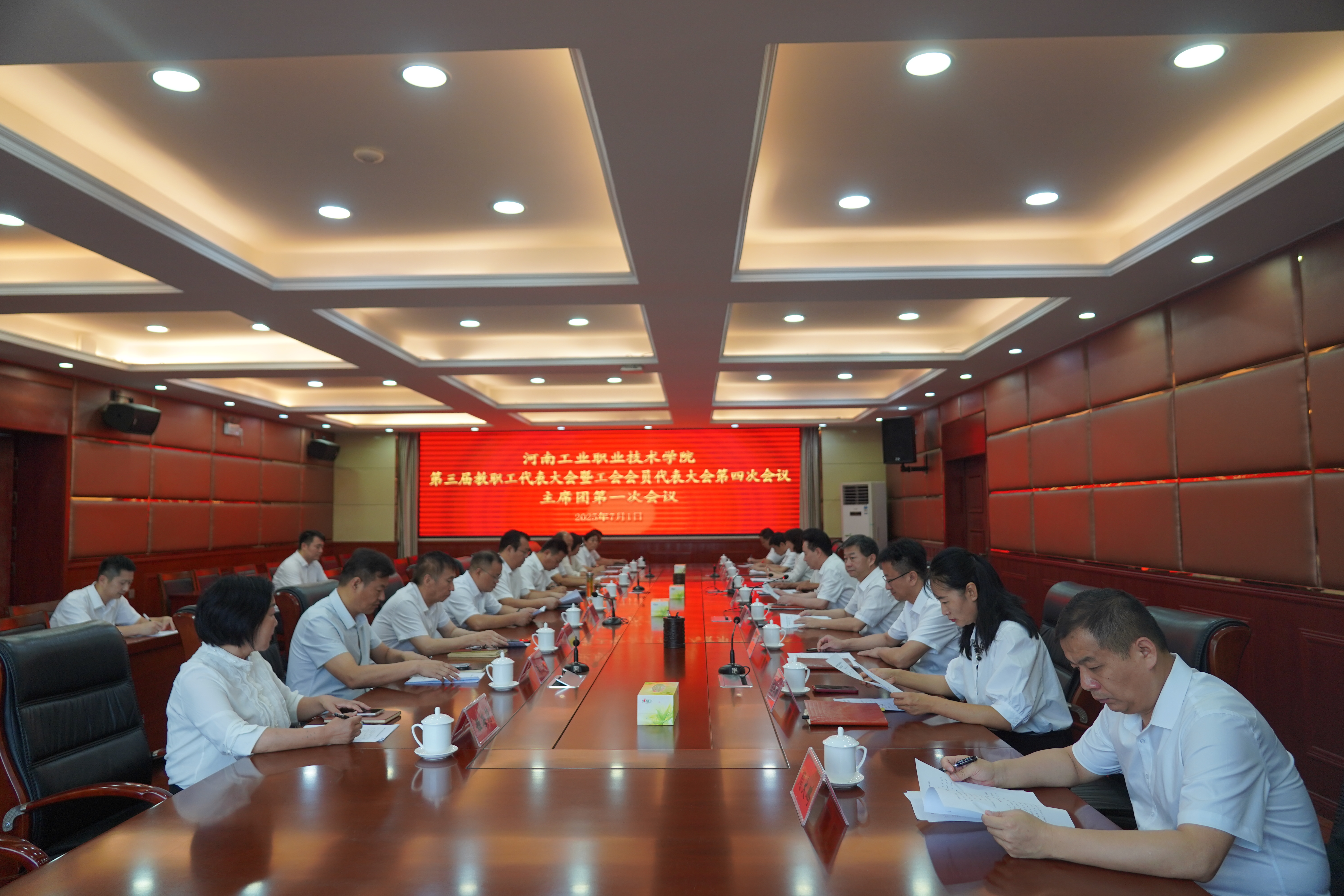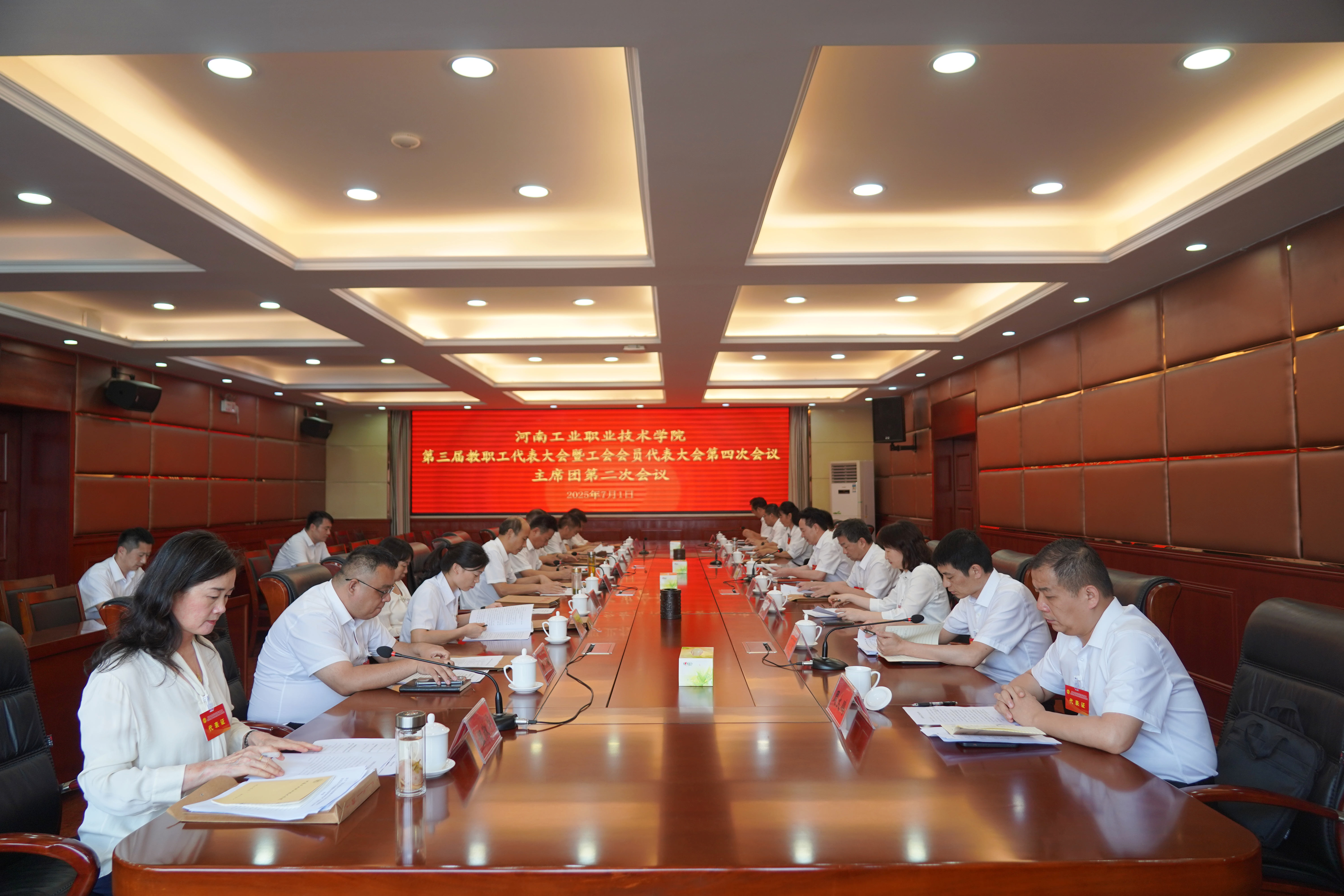下午15点30分,大会主席团全体成员在明德楼四楼会议室召开主席团第二次会议,听取六个代表团团长对审议事项的讨论情况汇报,表决通过了《河南工业职业技术学院第三届教职工代表大会暨工会会员代表大会第四次会议决议》(草案)。