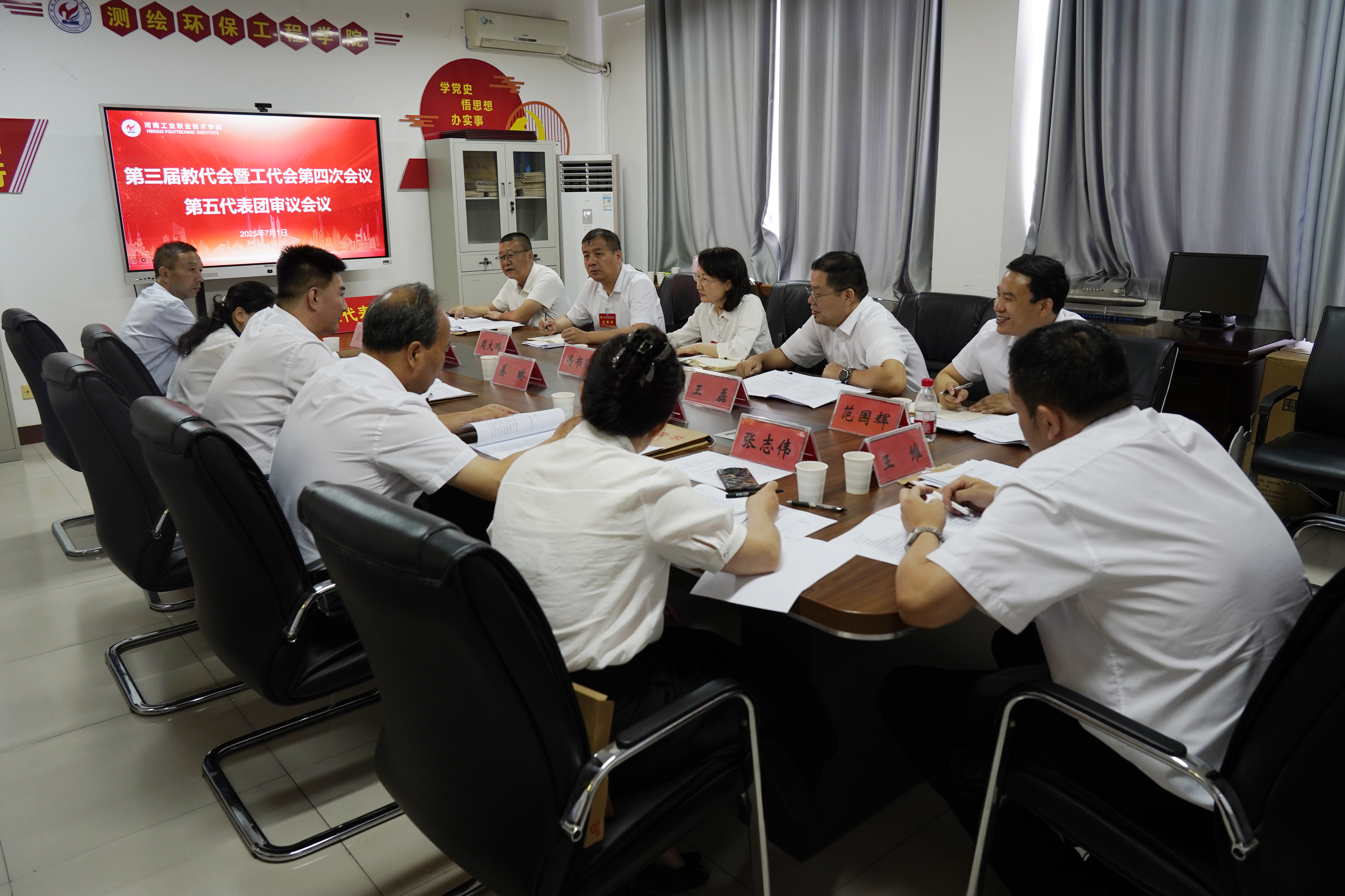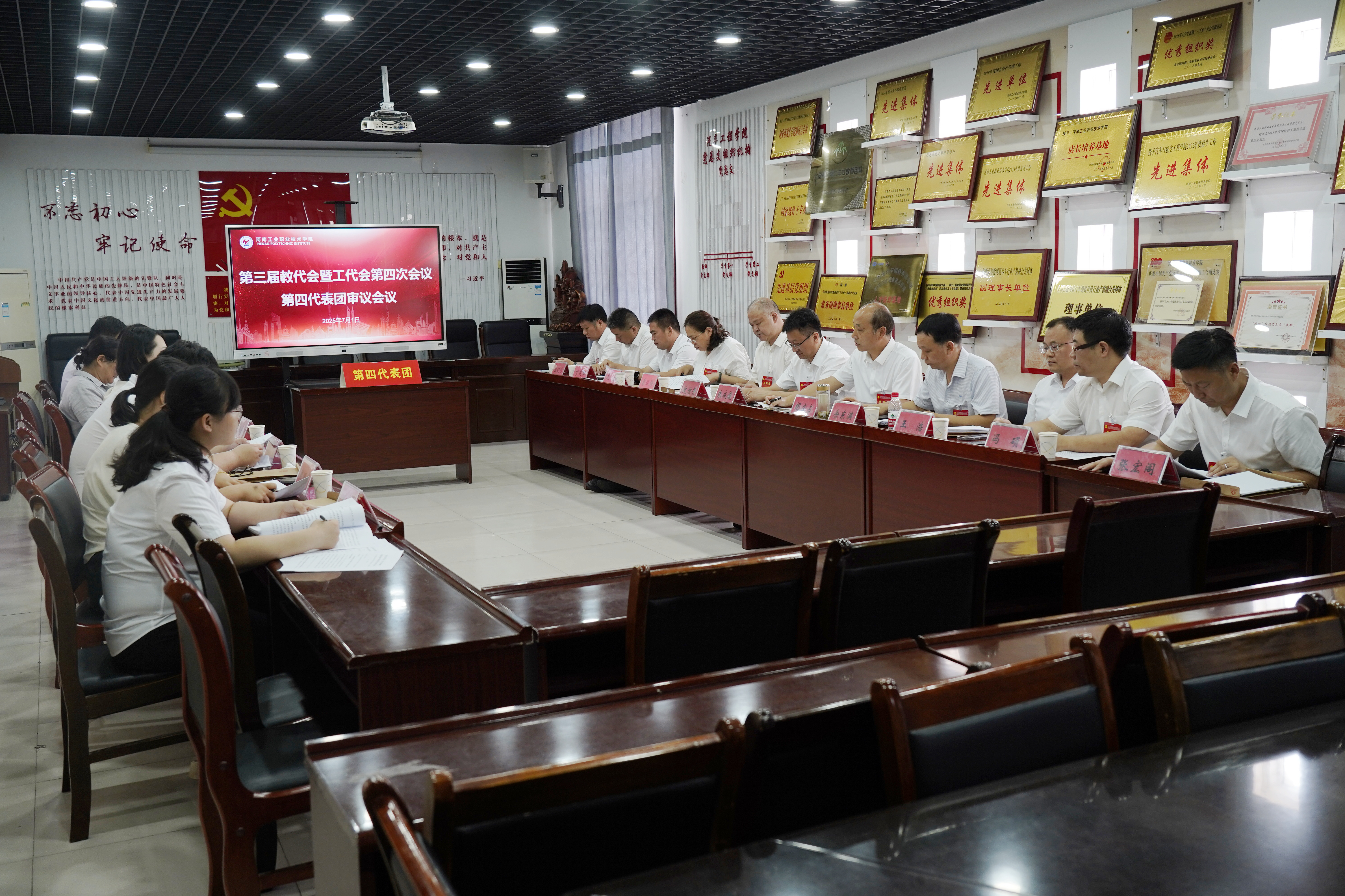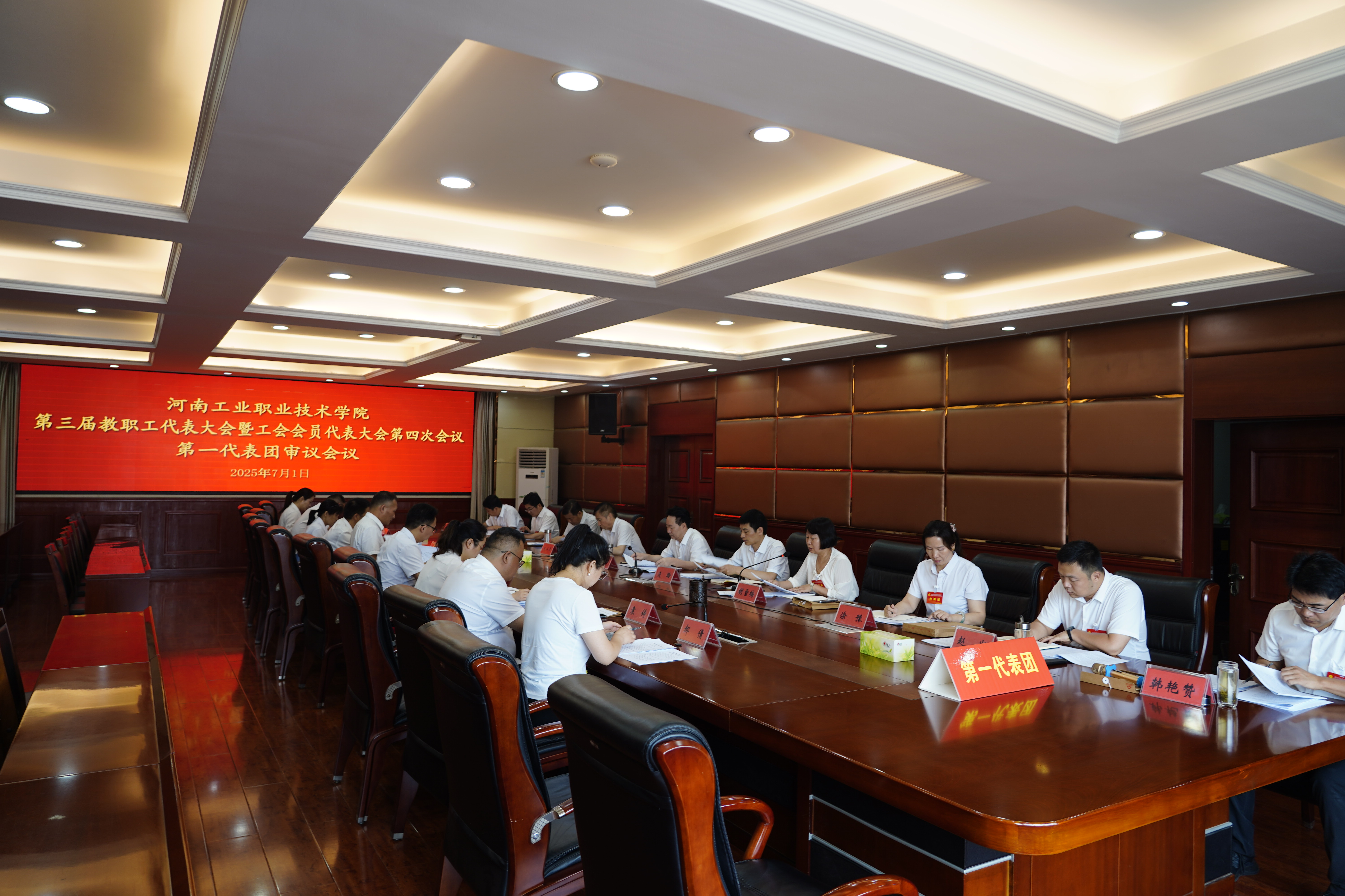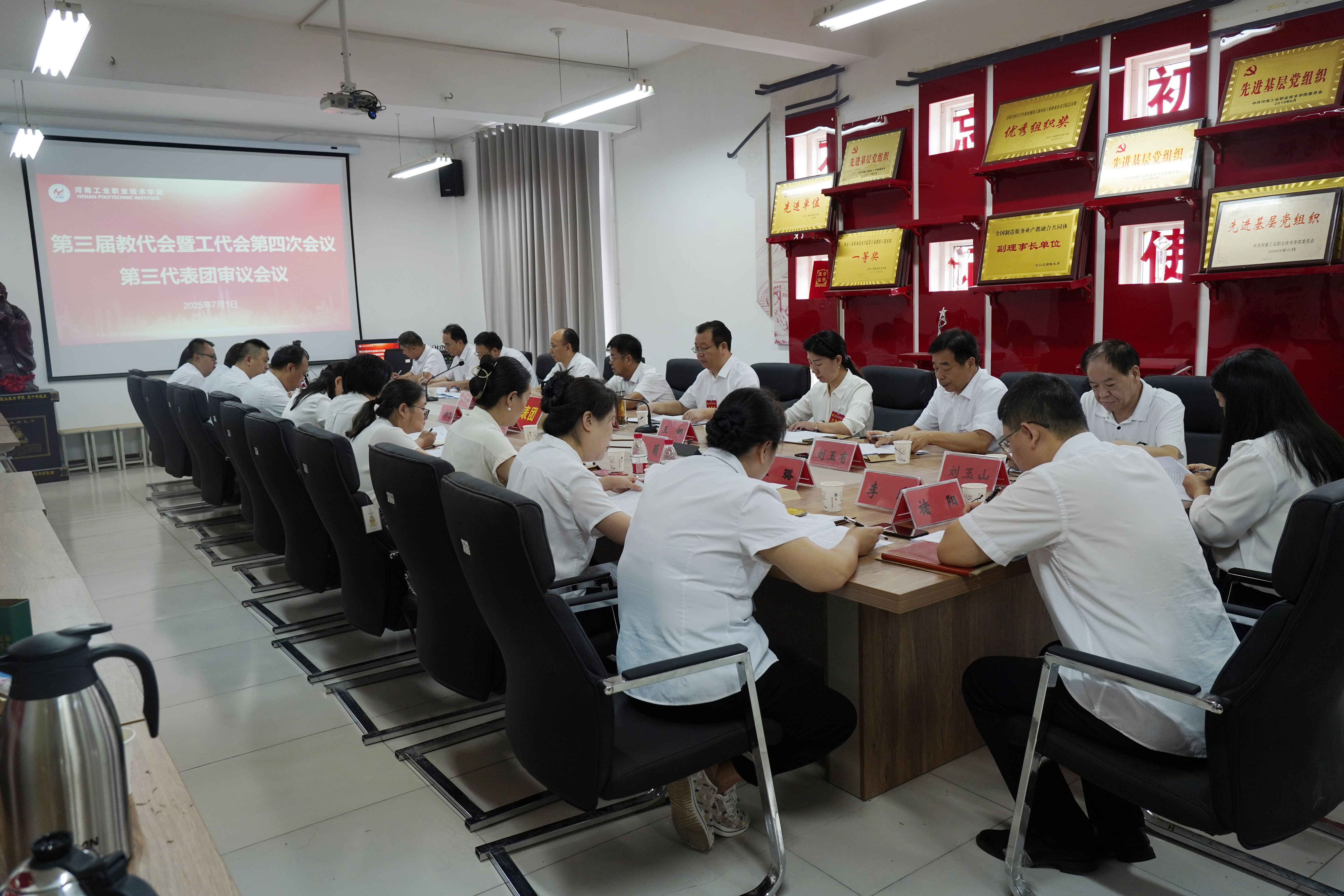 下午15点30分,大会主席团全体成员在明德楼四楼会议室召开主席团第二次会议,听取六个代表团团长对审议事项的讨论情况汇报,表决通过了《河南工业职业技术学院第三届教职工代表大会暨工会会员代表大会第四次会议决议》(草案)。