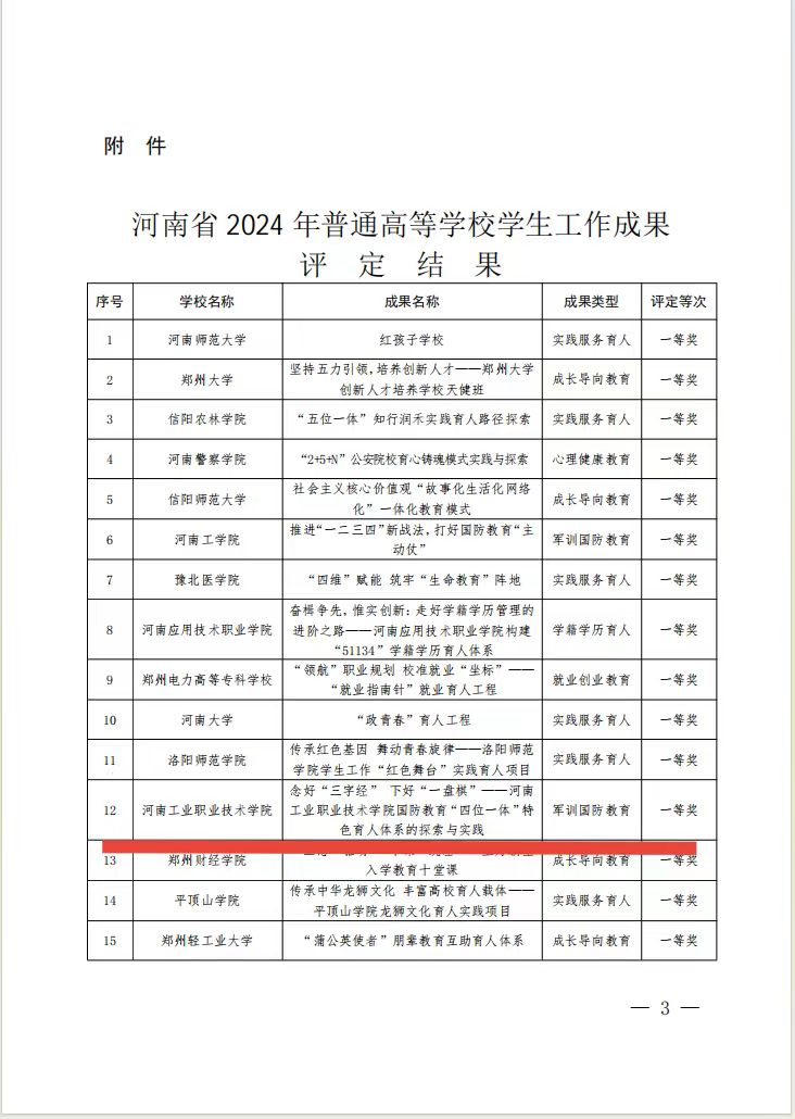 近日,2024年河南省普通高等学校学生工作优秀成果奖揭晓,我校《念好“三字经” 下好“一盘棋”——河南工业职业技术学院国防教育“四位一体”特色育人体系的探索与实践》军训国防教育项目荣获一等奖,这是我校在此项评选中获得的历年最好成绩。