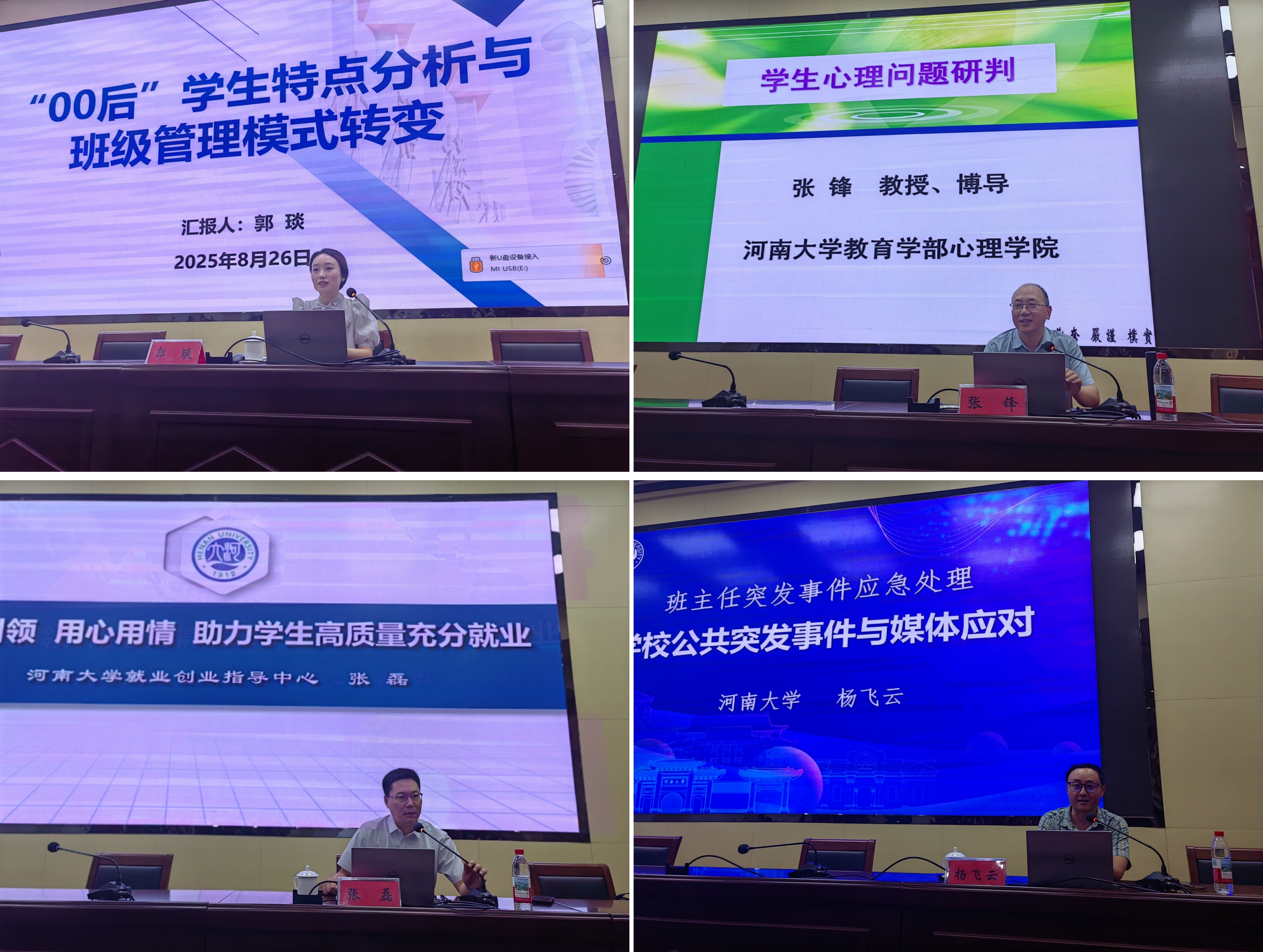 在为期两天的培训中,河南大学外语学院研究生与科研办公室副主任、河南大学“对话青蓝”辅导员网络思政工作室成员郭琰,河南大学心理学院副院长、河南省高校科技创新人才张锋,河南大学就业创业指导中心主任张磊,河南大学外语学院党委副书记、河南省教育人才学会专家成员、河南省家庭教育专家团成员杨飞云等4位专家分别围绕《“00后”学生特点分析与班级管理模式转型》《学生心理问题研判》《科学引领助力学生高质量充分就业》《班主任突发事件应急处理:学校公共突发事件与媒体应对》等主题作专题报告。