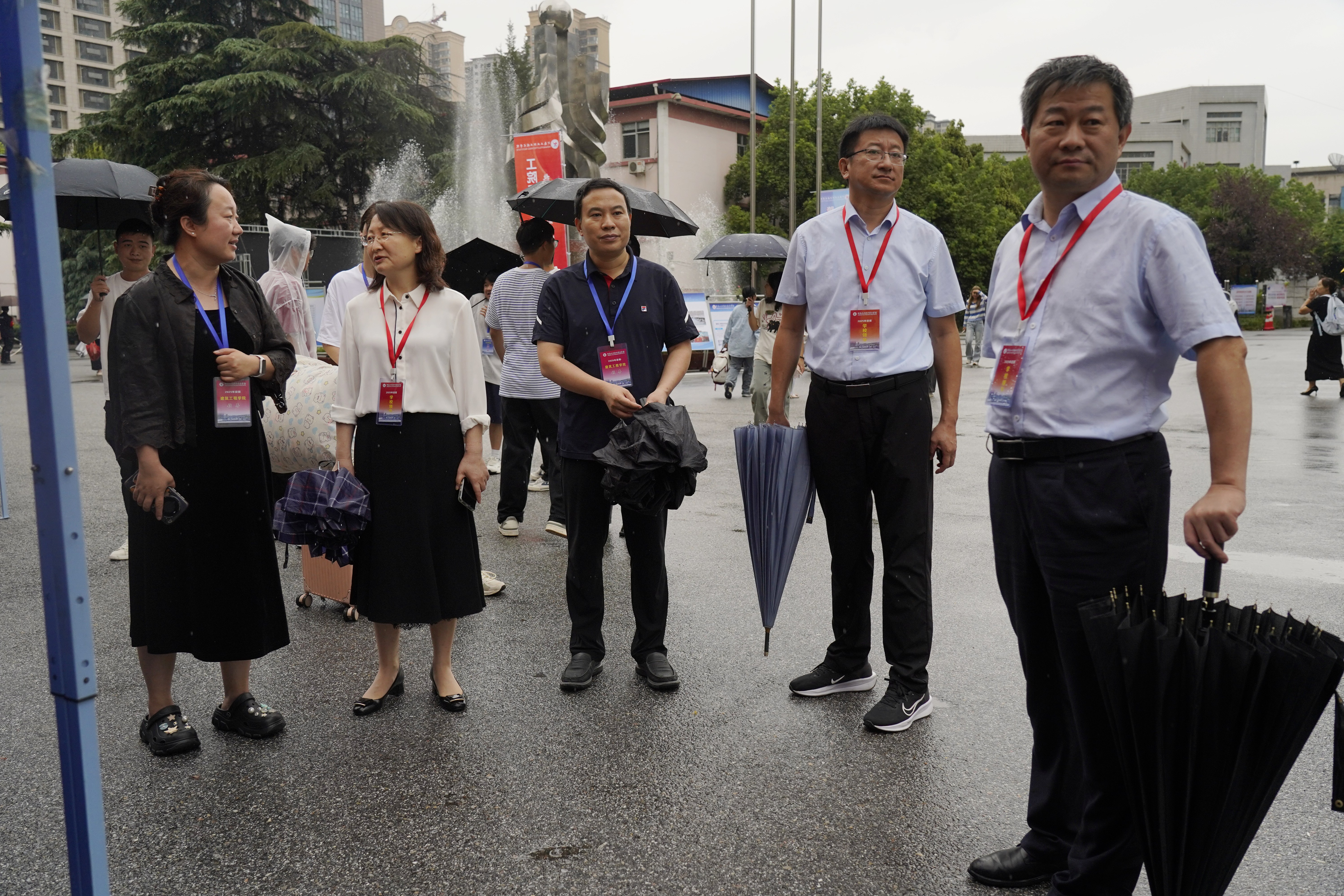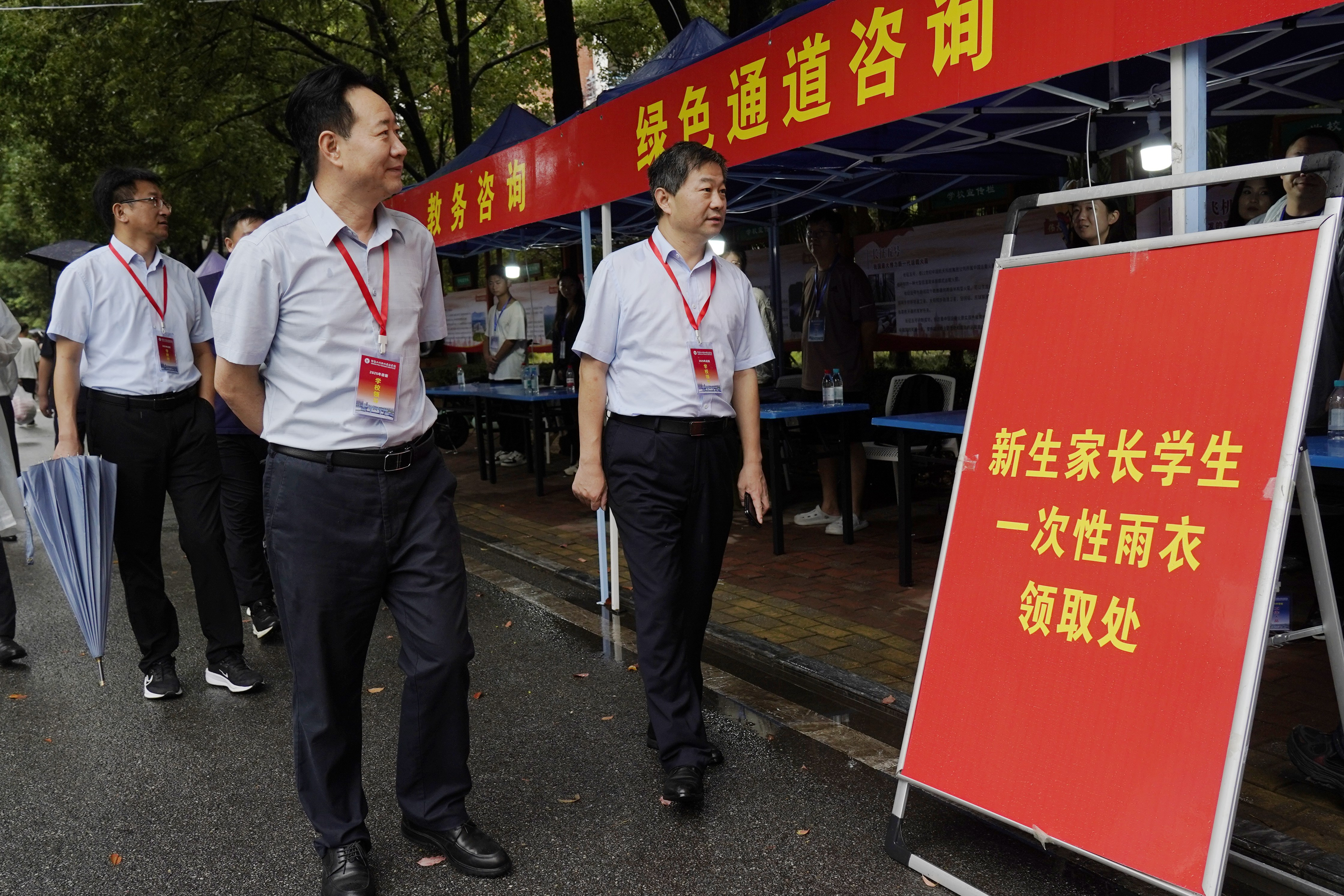 9月6日,秋雨淅沥,校园内丹桂馥郁,彩旗迎风。校领导屈保中、马小兵、朱成俊、冯书丽、王宏颖,带领党政办公室、党委宣传部、党委学生工作部、保卫处等部门,冒雨深入孔明校区、光武校区迎新现场,检查指导工作,看望2025级新生并慰问参与迎新工作的师生。