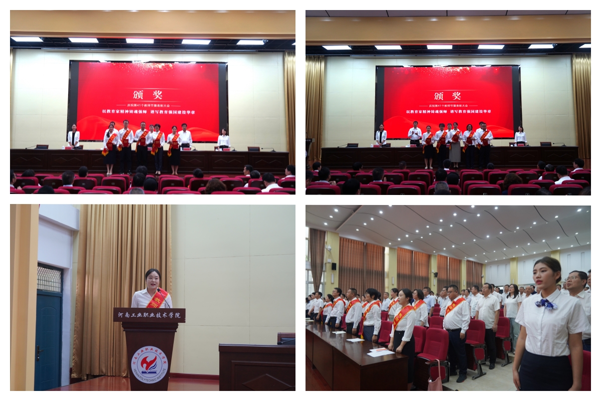 9月9日下午,学校在孔明路校区大学术报告厅隆重举行庆祝第41个教师节暨表彰大会。校领导马小兵、贾庆成、朱成俊、冯书丽、王宏颖出席会议,全体中层干部、受表彰教师代表及师生代表参加会议。会议由副校长贾庆成主持。