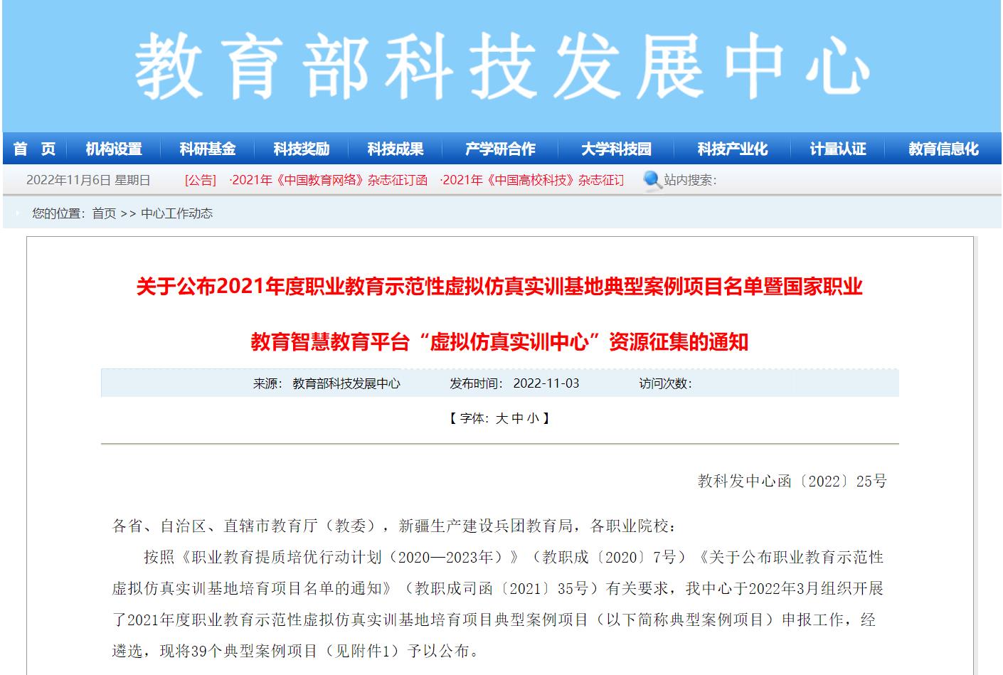 近日,教育部高等学校科学研究发展中心发布《关于公布2021年度职业教育示范性虚拟仿真实训基地典型案例项目名单暨国家职业教育智慧教育平台“虚拟仿真实训中心”资源征集的通知》,公布全国39个典型案例项目,