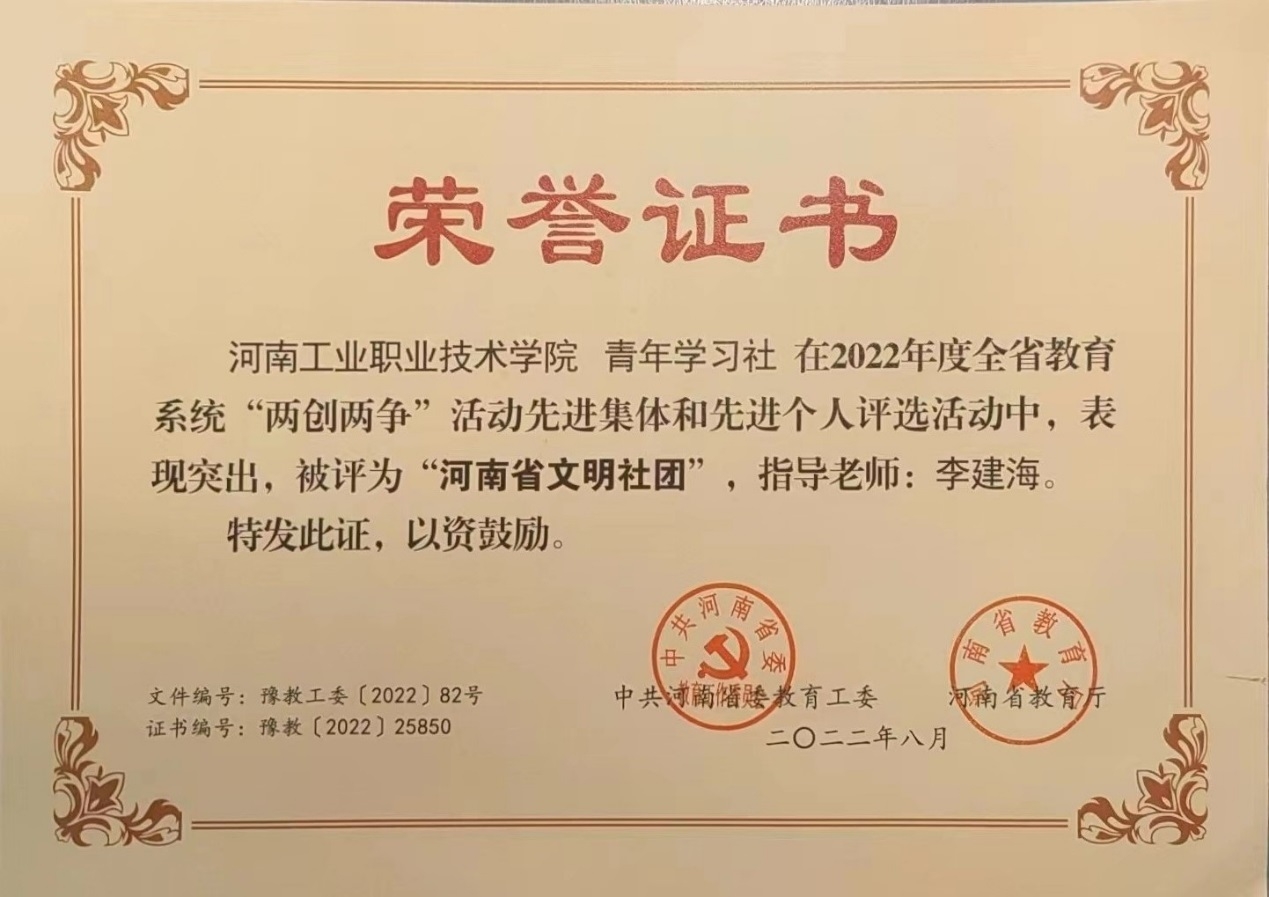 2022年度全省教育系统“两创两争”活动先进集体和先进个人评选结果揭晓,我校青年学习社荣获“河南省文明社团”称号。青年学习社是在校党委领导下,校团委具体指导下,由自动化工程学院负责日常管理的思想政治类