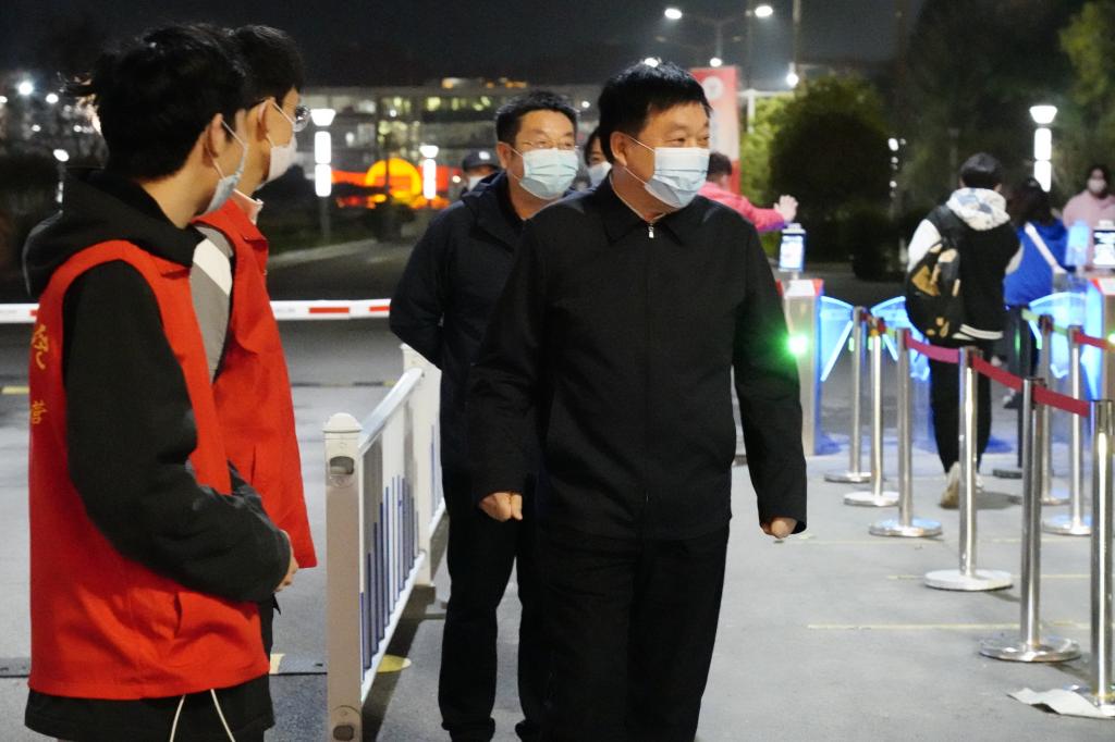 为做好校园疫情防控工作,落实落细防控措施,全力保障师生健康和校园安全,10月6日晚,校长王伟深入一线检查指导校园疫情防控和安全保卫工作,慰问节日值班值守人员。王伟一行先后来到孔明路校区南门、东门,慰问