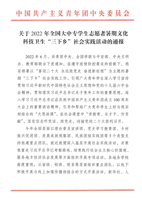 近日,共青团中央印发《关于2022年全国大中专学生志愿者暑期文化科技卫生“三下乡”社会实践活动的通报》,河南工业职业技术学院团委荣获2022年“三下乡”社会实践“优秀单位”荣誉称号,是河南省唯一入选的