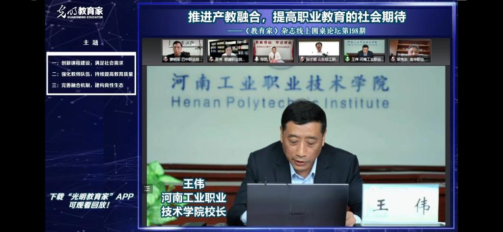 为推进对《职业教育法》的深入学习理解,5月18日下午光明日报《教育家》杂志组织线上圆桌论坛,特邀我校校长王伟主持论坛,并就“推进产教融合,提高职业教育的社会期待”主题,与金华职业技术学院、顺德职业技术