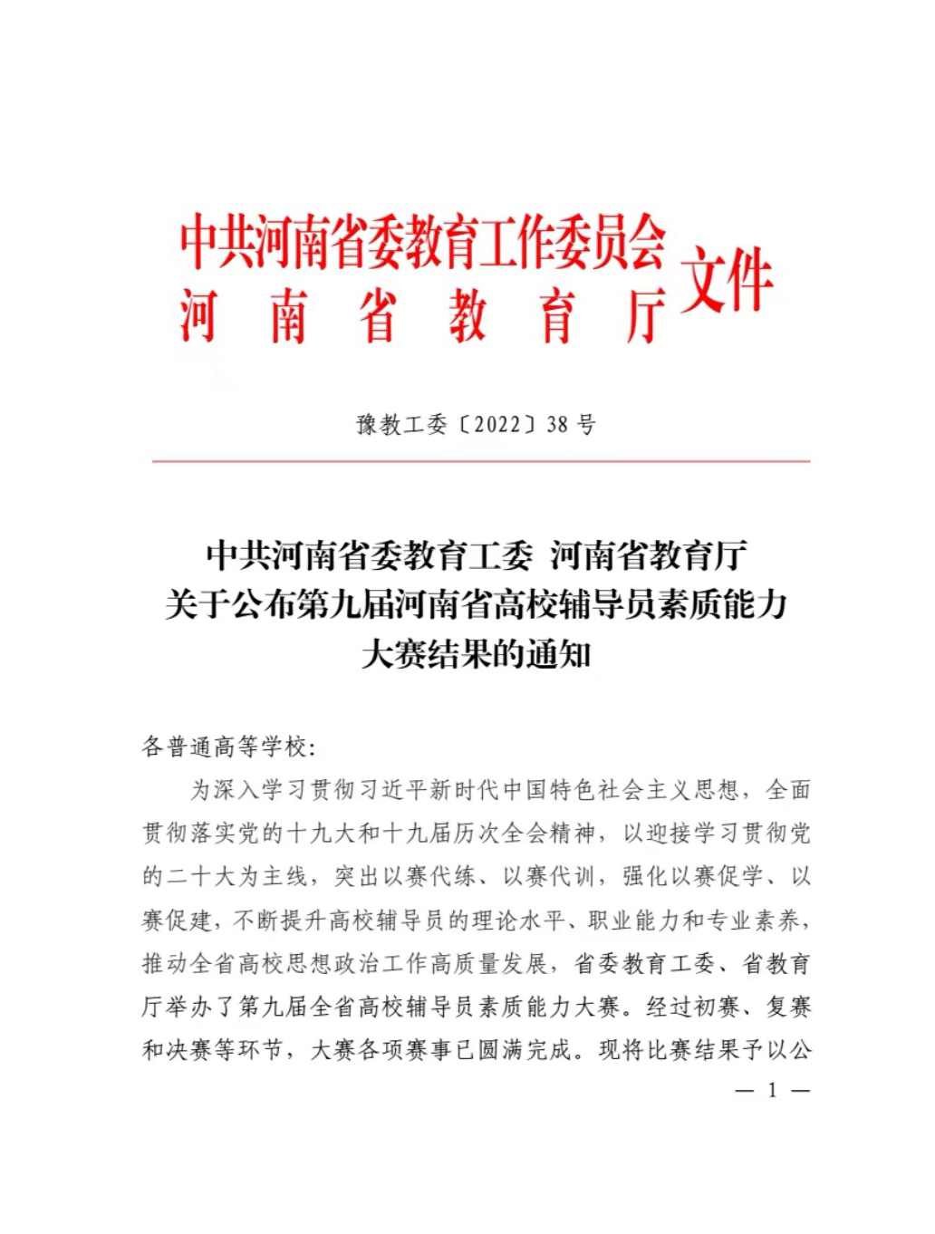 近日,省委教育工委、省教育厅印发《关于公布第九届河南省高校辅导员素质能力结果的通知》豫教工委〔2022〕38号,我校电子信息工程学院辅导员朱源源老师荣获一等奖。第九届河南省高校辅导员素质能力大赛由中共