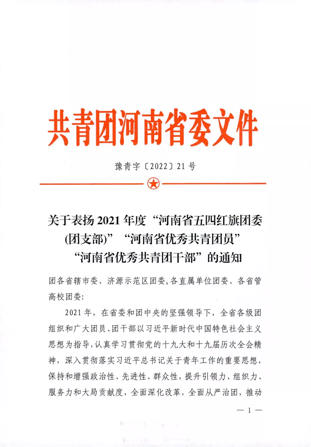 近日,共青团河南省委印发《关于表扬2021年度 “河南省五四红旗团委(团支部)”“河南省优秀共青团员”“河南省优秀共青团干部”的通知》,校团委被授予“河南省五四红旗团委”称号,机械工程学院团总支被授予