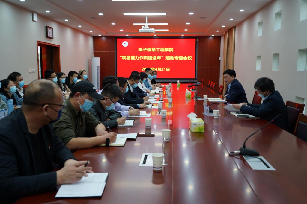 4月21日下午,电子信息工程学院在学院会议室召开“观念能力作风建设年”活动专题会议,党委书记温道军参加会议并指导工作,党政办公室主任马小兵对专题会议进行督导,电子信息工程学院全体党政领导、全体副科级干