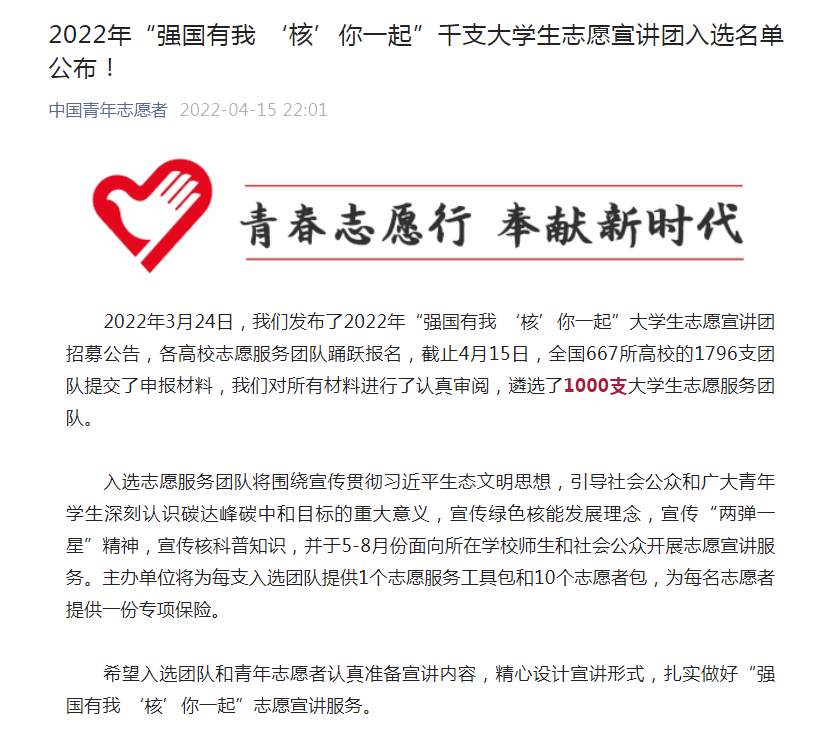 为深入宣传贯彻习近平生态文明思想,引导社会公众和广大青年学生深入理解“碳达峰、碳中和”的深刻内涵和重大意义,团中央青年志愿者行动指导中心、中国核工业集团有限公司、中国青年志愿者协会秘书处联合开展“强国