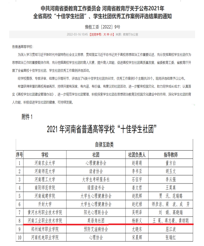 近日,从河南省教育厅传来喜讯,由河南省委教育工委、省教育厅共同发起的《关于开展2021年全省高校学生社团品牌建设系列活动的通知》(教思政函〔2021〕766号)暨全省高校 “十佳社团”评选落下帷幕,我